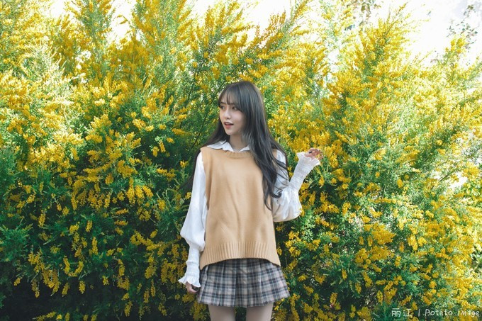 拍摄照片提早起来,阳光并没有那么强烈,寻找到一处没阳光直射,花儿随处可见的街道,邀请妹子自由自在地玩耍拍摄。