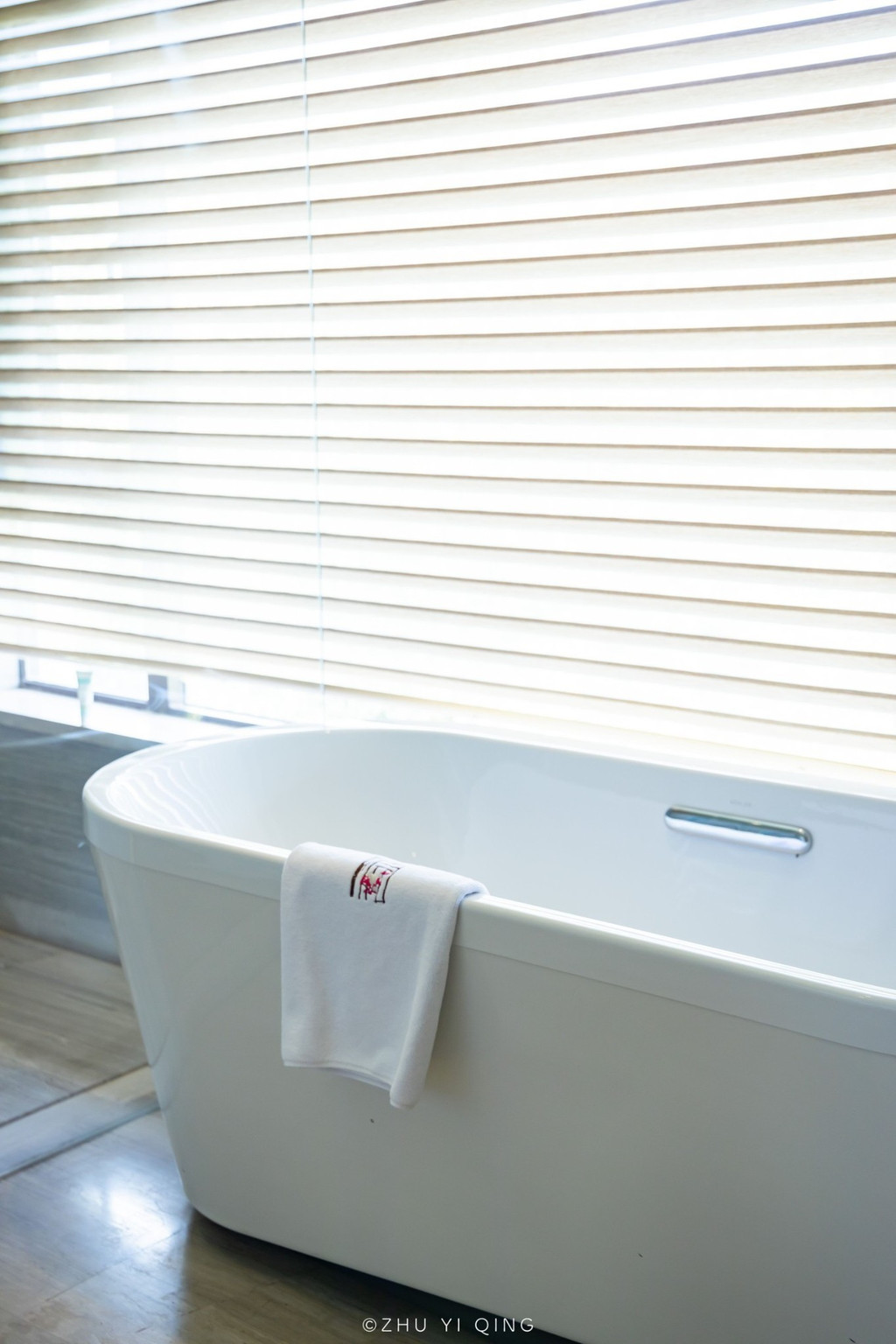 每层楼都配有了卫生间,一楼是客卫,二楼是淋浴的,三楼有浴缸,拉开百叶窗,还能看到屋外的玉龙雪山,在这里泡澡可是太舒服了。