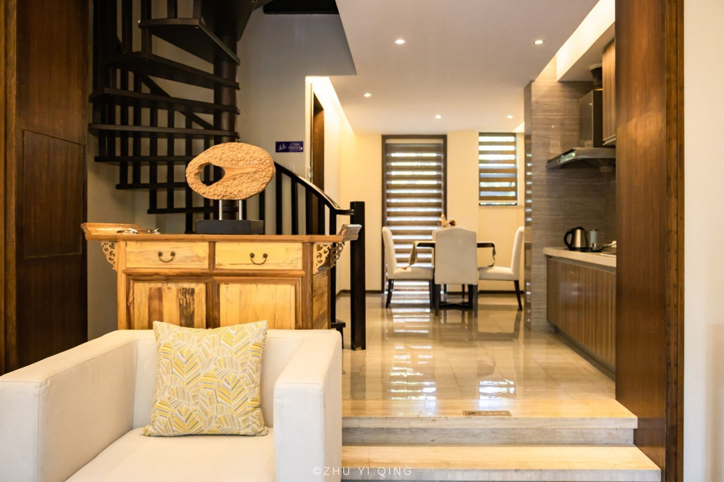 客厅进去就是厨房,没错,住在悦云别院是可以自己做饭的,一家人住在一起,还可以做饭,其乐融融,有回家的感觉。而厨房的里面就是餐厅,一家几口人在这里吃饭妥妥地没问题。而在厨房的对面,就是旋转楼梯,可以通往二楼,这楼梯的设计还挺有巧思的。
