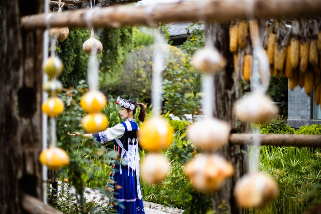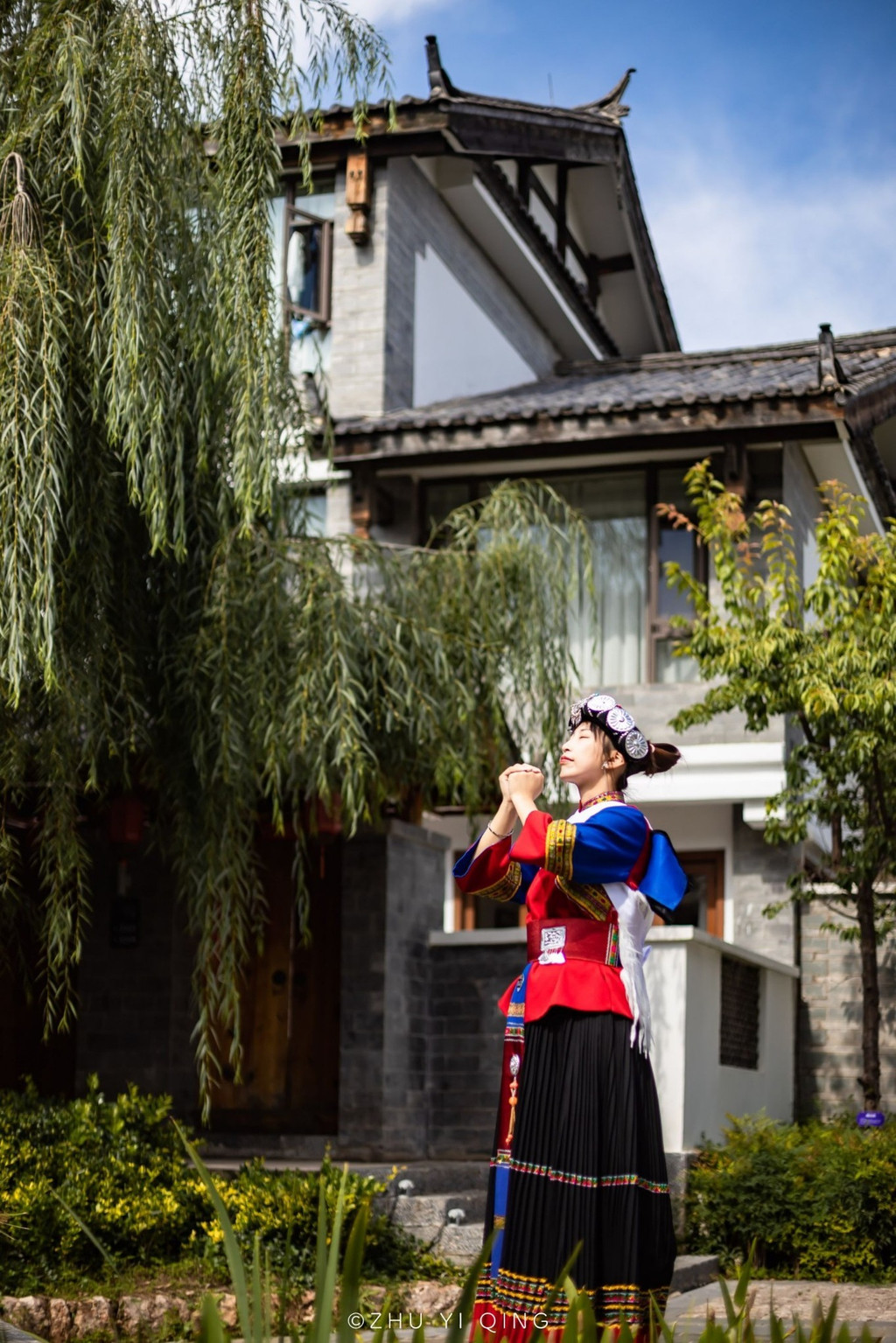 酒店里有好几款纳西风格的衣服和头饰、挑选自己喜欢的搭配起来,在庭院里拍一组纳西姑娘的大片,这一刻,我才感觉自己真正融入了丽江。