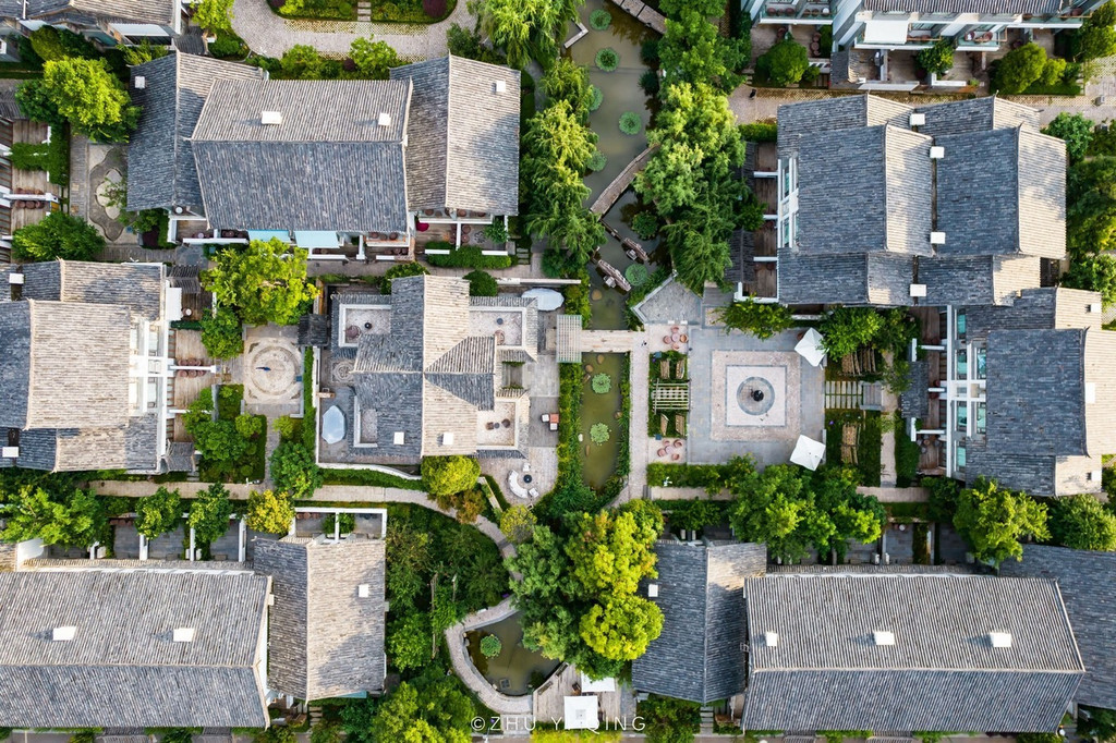 院落包围着庭院,从上空看,悦云别院就像座园林一样,植被非常茂密,池水穿院而过,在这里,有山有水,有树有花,是一个非常适合旅居的度假型酒店。