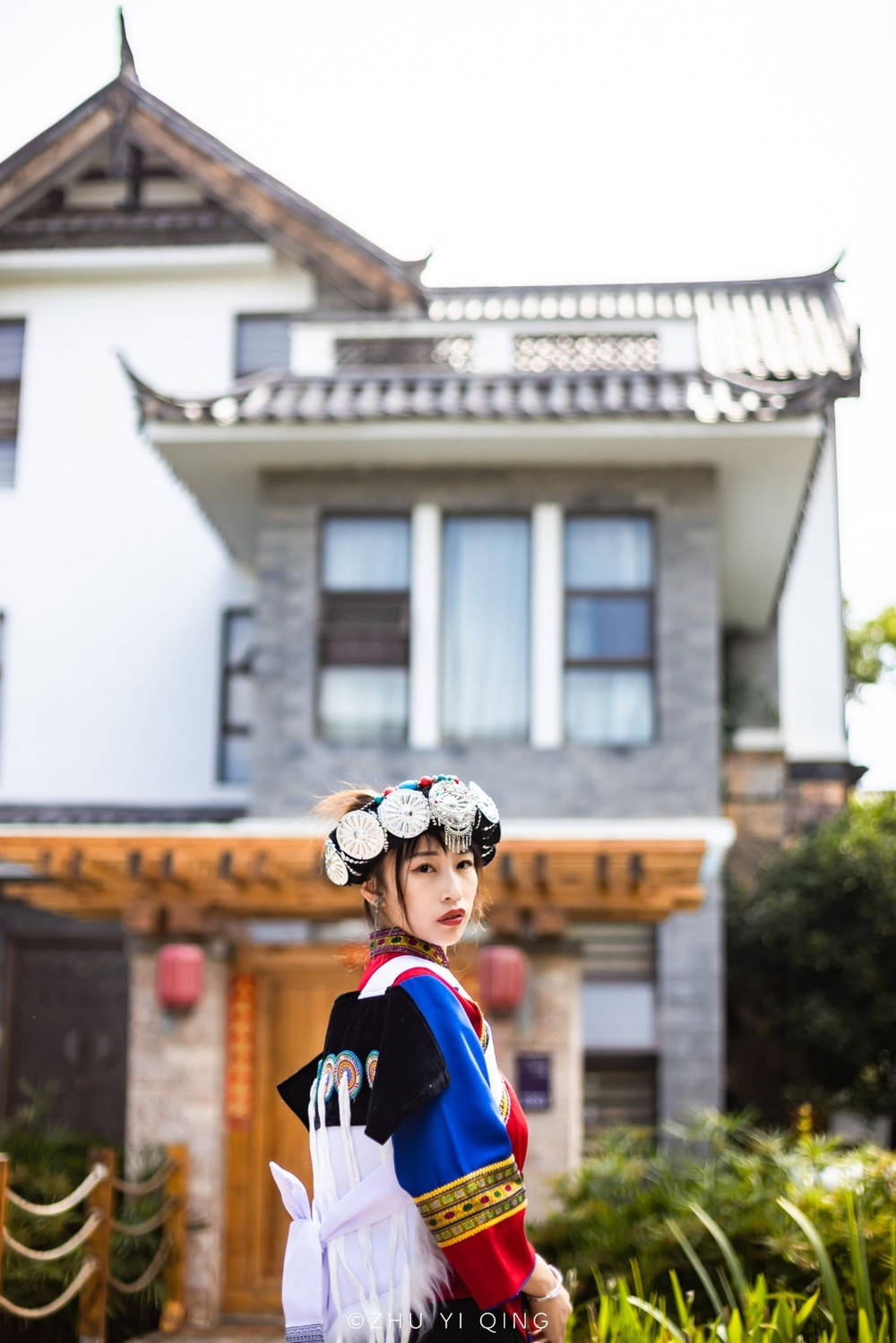 我更喜欢这套红色风格的纳西族服装,红黑蓝相配,浓浓的民族风情,在庭院里走着,还引得不少人围观侧目。
