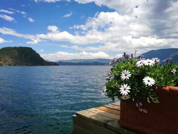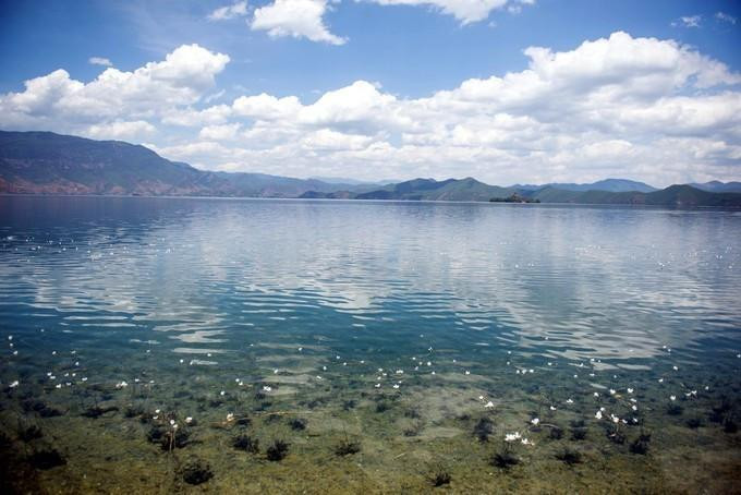 情人滩。泸沽湖的水清澈见底,起初我以为白色的小花是撒在湖面上的,后来仔细看发现它们是从水里长出来在水面开花,叫做水性杨花。很有特色,也很诗意