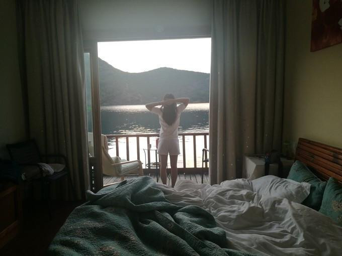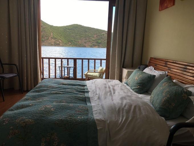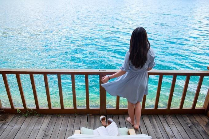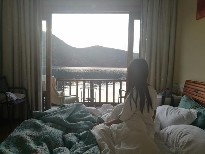 到了彼岸客栈啦,一进门就被眼前的景色震撼到了,之前看到酒店评价说这家客栈是岛上唯一一家真正临湖的客栈,阳台外面就是湖水,有一种飘在湖面上的感觉。虽然有点奢侈,但这种体验真的是独一无二的。