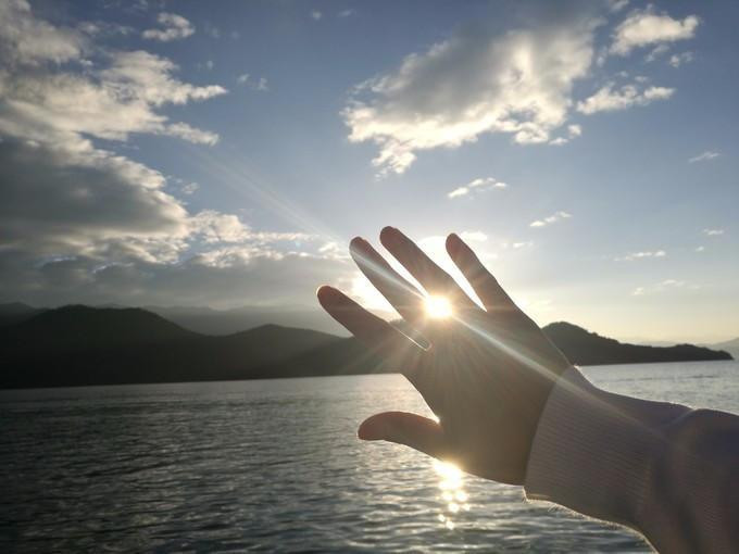 看完日出,咱们坐船回去啦。我闭着眼睛,享受这一刻阳光洒在脸上的感觉。