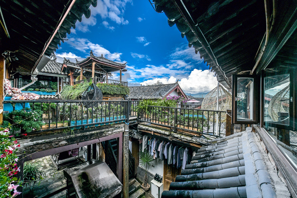 阅古楼大门口有一处网红打卡拍照地,在楼顶建造一个水池子,将天空倒映在水中,营造出古城的天空之境,看起来非常有意思!山野君首次来阅古楼客栈就感觉很好,所以每次来丽江古城旅游都会选择这家客栈。这样的观景视角真的太赞了,哪能不惹人喜欢呢?