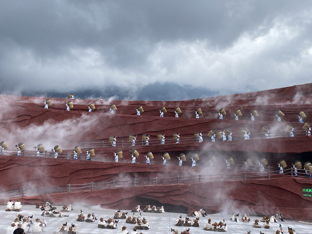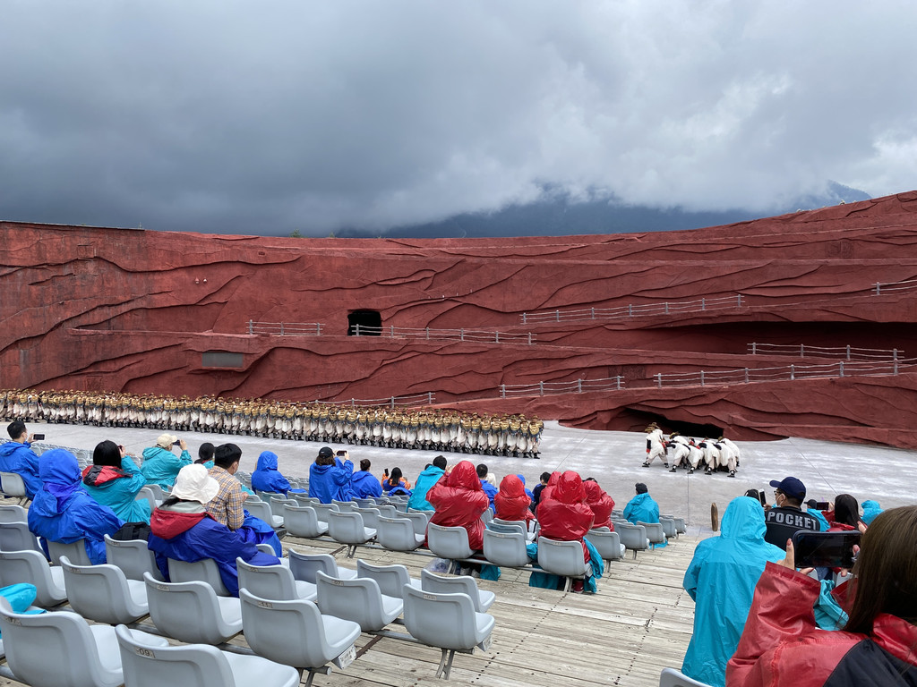 玉龙雪山的最后行程,印象丽江演出,据说是恢复表演的第一场,很幸运。开场前每人发了雨衣,不建议打伞,影响别人观赏。观看的时候真的下了不小的雨,雨衣质量很棒,不用担心会淋湿。司机师傅介绍印象丽江的演员都是丽江的本地人,他们以雪山为背景,介绍自己的名字和民族,表演骑马、喝酒、劳作和婚嫁文化。即使下雨了,演员们也完全投入到表演中,让人钦佩。