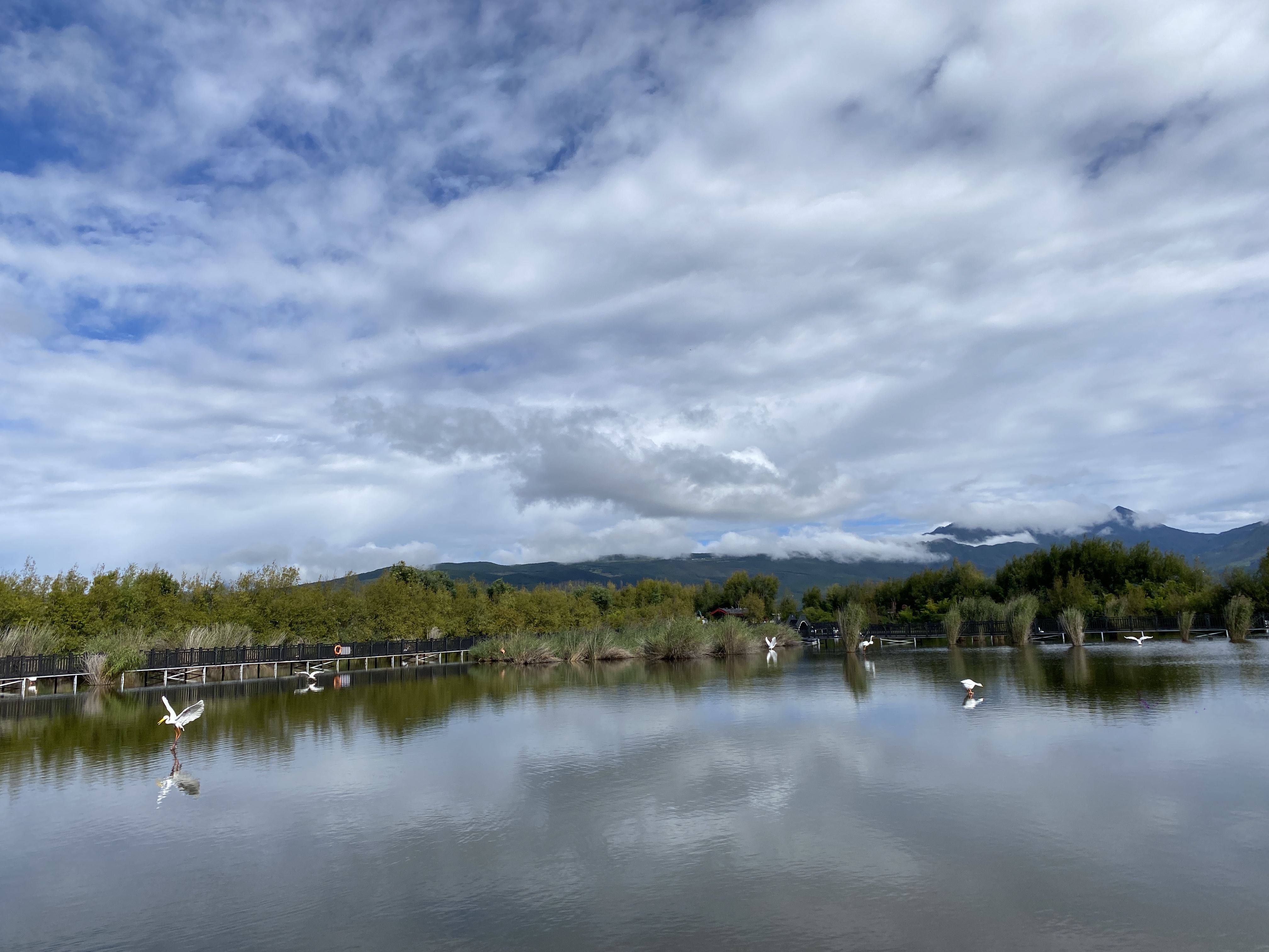 拉市海的体验不太好,主要是滴滴司机1号没有按照我的目的地定位走,原本想定位到西湖(看大众DP上的网友是这么走的,拍照风景很美),但是1号司机竟把我送到了拉市海附近的一家旅游公司门口,想忽悠我骑马,当然也有卖单纯的门票+/-车票,旅游公司大门距离景区的距离有点远,所以车票还是得买。买了门票进入景区后发现拉市海景区里面也没有什么实质性风景,比较好的景观位都被所谓的网红拍照点占据。天气未冷,过冬的鸟类也还没有抵达,水面上可见几只常驻小野鸭。景区内一部分还处于建设中的状态,所以就沿着步行栈道走了走。由于天空很美,远处也有山,拍照出品都是美的。从拉市海出来后叫了滴滴车去白沙古镇,沿路看到当地人自己的院子里种了整片的向日葵,田里种着苹果和雪桃,心情又好了起来。云南的水果物种很丰富,基本上本土的水果已经多到吃不过来,丽江泸沽湖的苹果、红河州的香蕉、火龙果、石榴,绝对物美价廉。