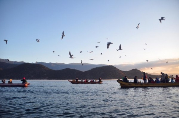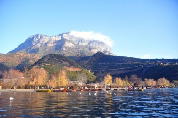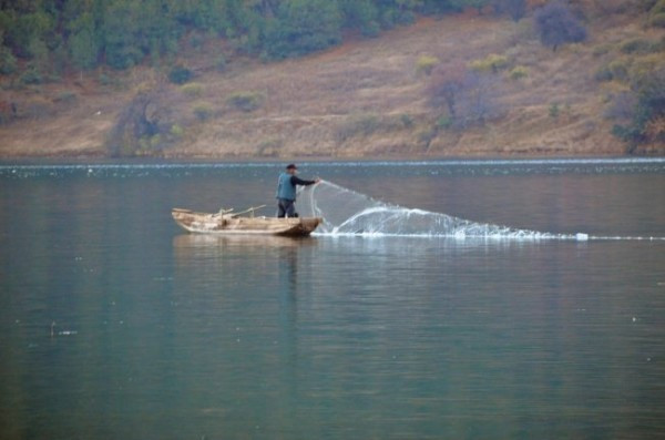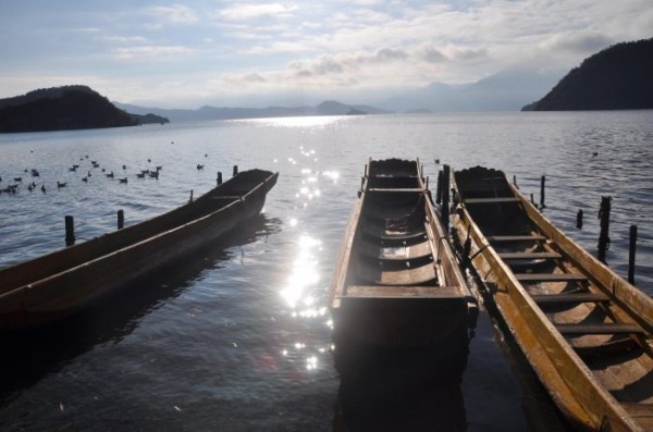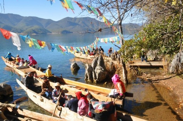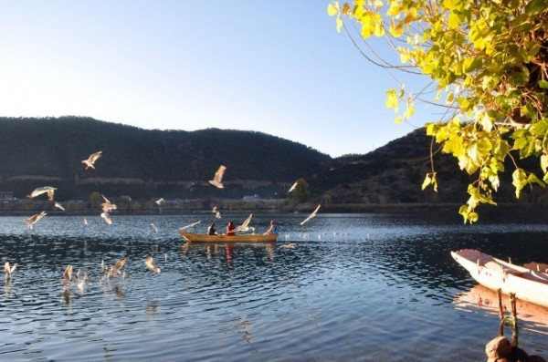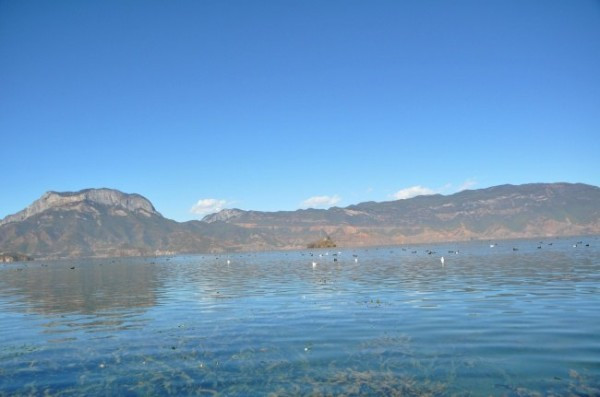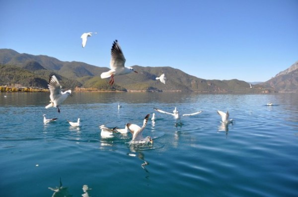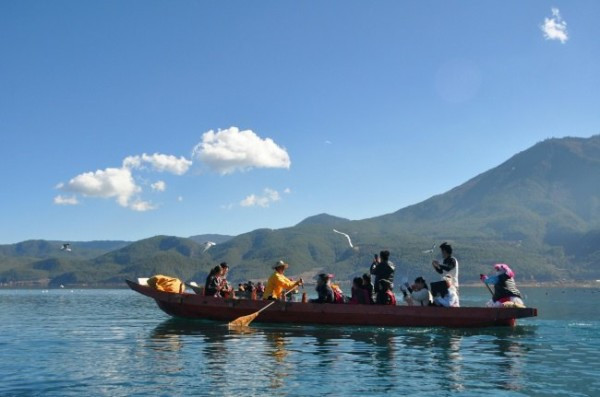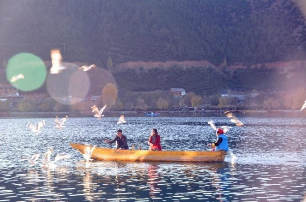 第一站是在大落水乘船登里务必岛,这个时候泸沽湖已经有很多西伯利亚飞来的海鸥(那些发微信问我外国海鸥好不好吃的吃货,我BS你们),所以出发前阿琼MM除了挨个打电话提醒大家穿厚一点儿,还特别提醒可以带面包去喂海鸥(后来事实证明海鸥不仅吃面包,还吃薯片)。不过在这里喂海鸥可不要一次性把储备面包都喂完了,因为下一站里格还有大把的机会(当然你也可以选择再买或是早餐时留点儿摩梭粑粑)。乘船归来,第二站就是我们要住宿的里格村了,晚上还有反映摩梭人生活风俗的《》欣赏,有兴趣的还可以喝喝当地的走婚酒。