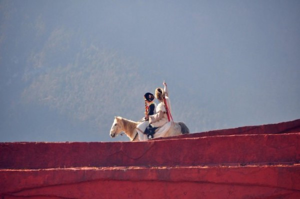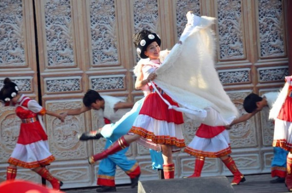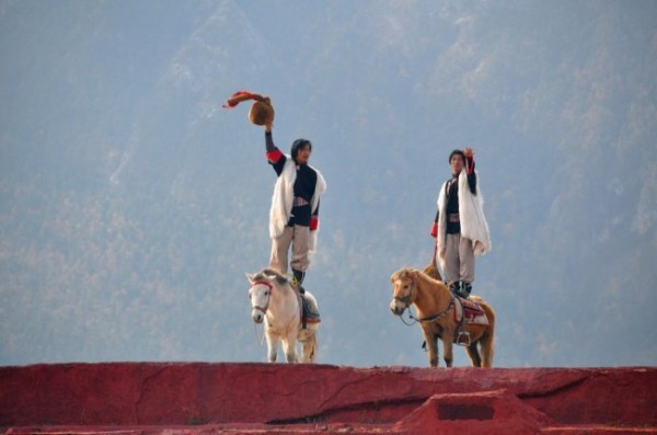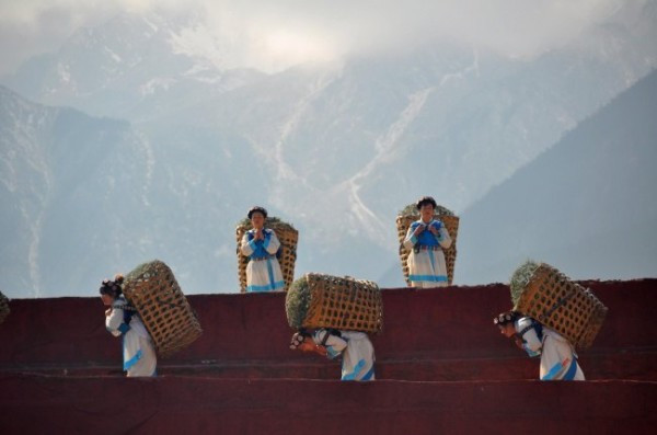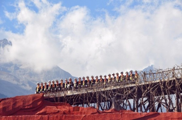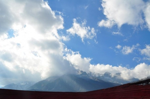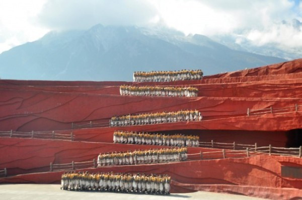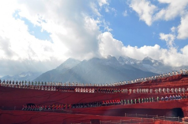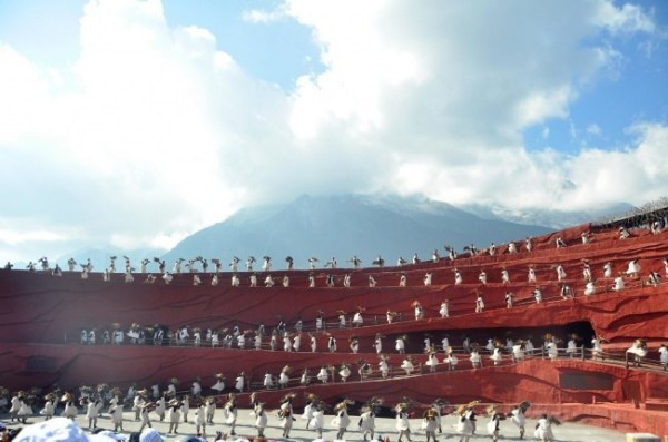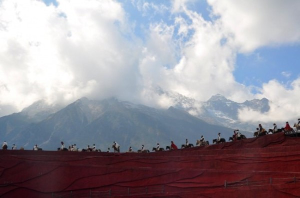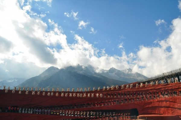 游完 河,下一站就是观看 的演出。 的阳光确实很好,不过这个点上看演出的话,阳光就有点儿太好了,晒得背上火辣辣的。老谋子的印象系列出了名的是大场面,但不得不说 这个天然无敌大背景实在太赞了。印象丽江是比较原生态的表演方式,不过同样的,里面还是能看到奥运会开幕式的一些FEEL,只是相比印象 来说要好得多。而且演员们不开麦直接放歌的表演方式也非常的精彩,个人感觉比印象西湖值得一看。