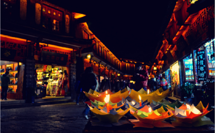 在四方街,你可以在溪流花海的烘托下游览具有明清“三坊一照壁,四合五天井,走马转角楼”特色的建筑,时机正好时你还能看见“薄暮涤场”这种极具特色和智慧的用高差冲洗街道的特色画面,品尝纳西特色美食。