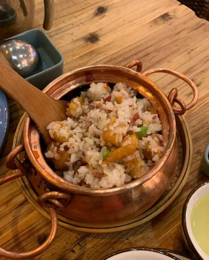 小锅饭,店里面特色招牌美食,里面有土豆和腊肉土豆焦香焦香的,加上腊肉好吃😋
