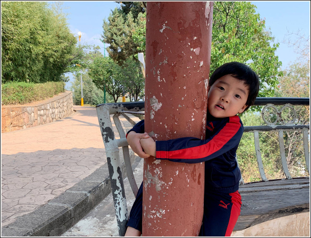 在山顶休息时,孙子摆出这姿势,让我给他拍个照。