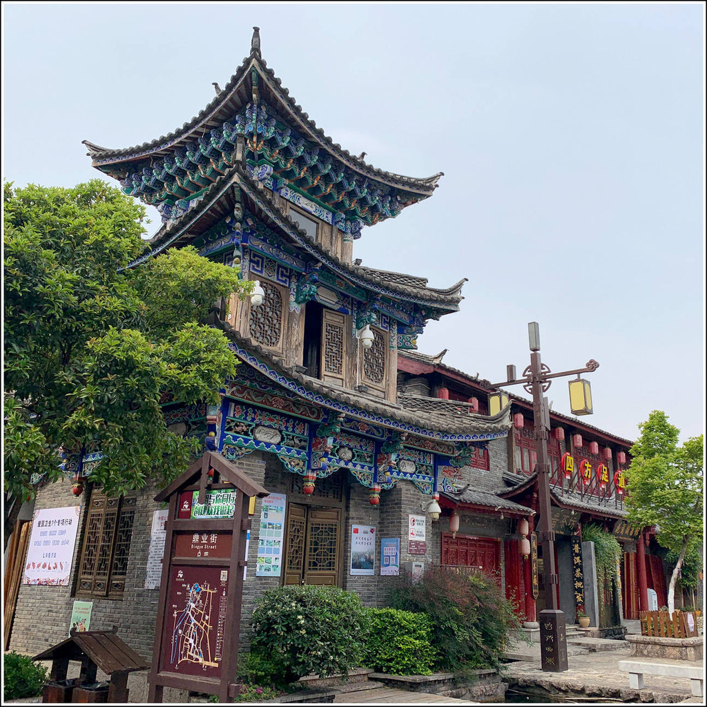 游客不算太多,街面干净整洁,建筑古朴有序。有些店铺,卖些当地特产,比如珠宝、银器、黄龙玉,自古就有“玉出云南”一说;也有卖吃食的,亦多为当地特色,如过桥米线、土鸡米线、云南小粒咖啡等。包浆豆腐,不好吃不要钱;牦牛肉、牛干巴、鲜花饼全国包邮。