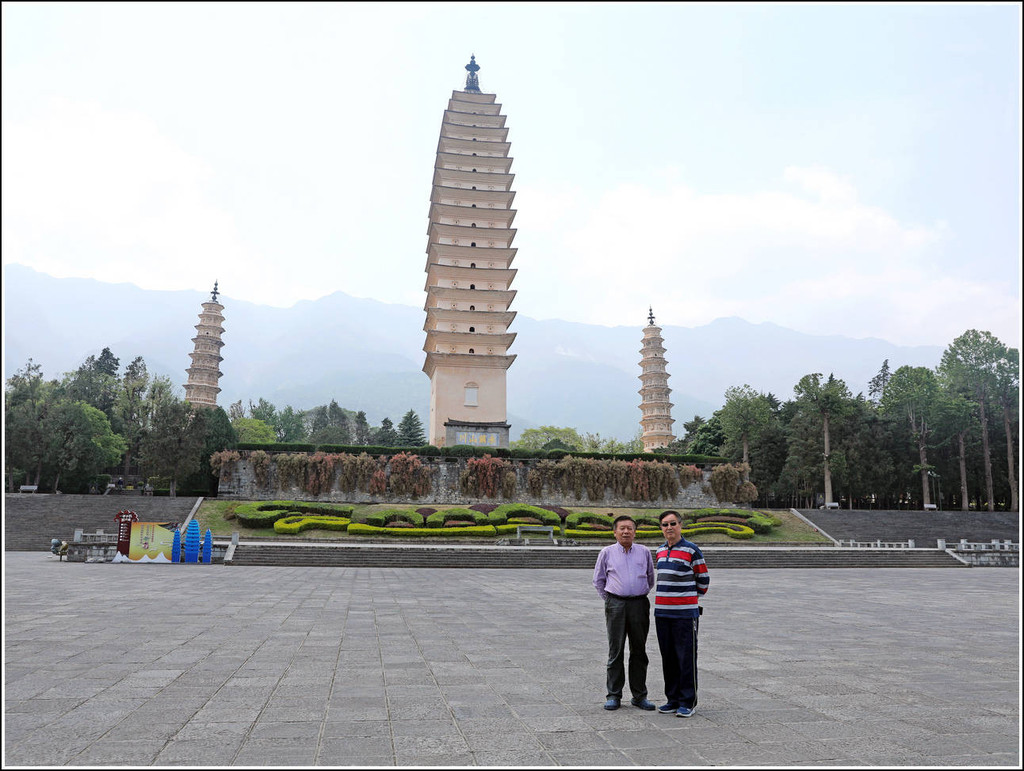我和亲家想照张合影,旁边没人,好在他带着单反。不知道是距离太远,还是角度有点低,人显得很小,也许是三塔太过高大了吧!下图: