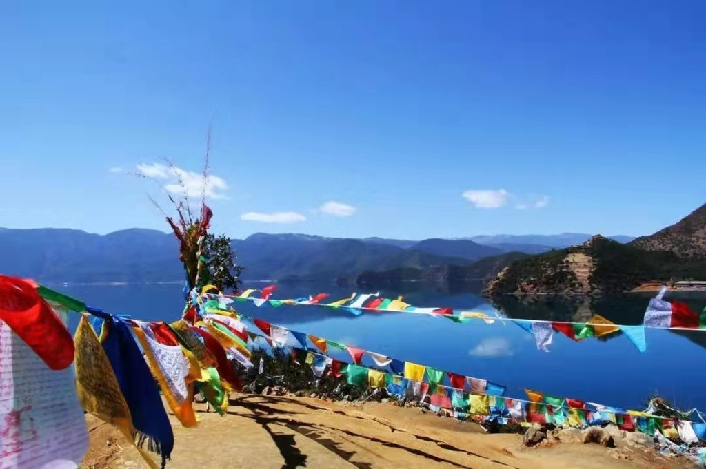 泸源涯是泸沽湖的源头,崖上有观景台可以俯瞰泸沽湖美景,崖口和树上挂满经幡。经幡飘动,石崖如削。