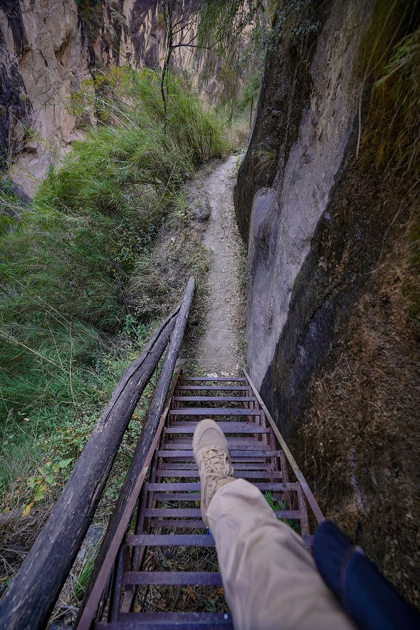 勇者天梯接近垂直,一共168级。第一段52级,70度角,第二段80级,50度角,第三段36级,60度角。四周密林环绕,旁边深谷湍流,就算不恐高也不敢轻易回头打量。