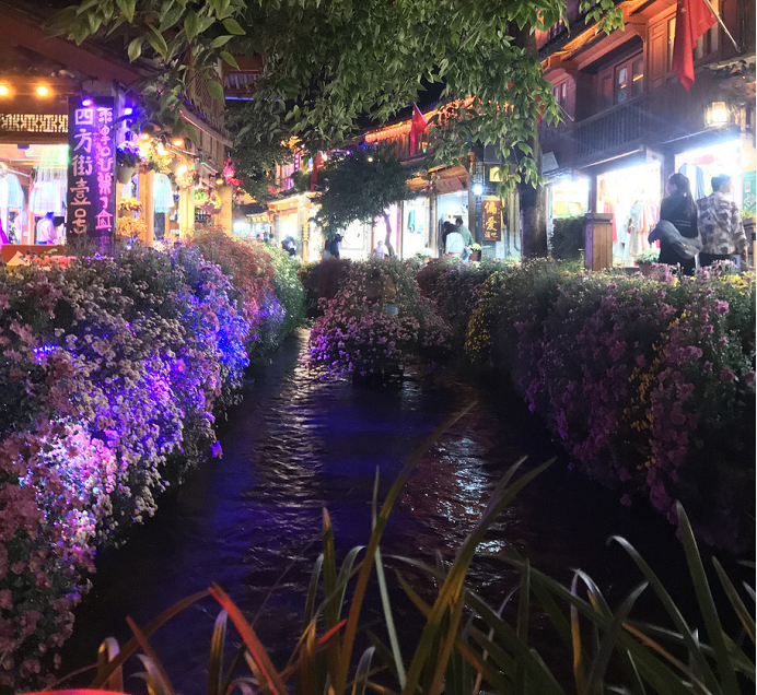 第一天,乘坐飞机到达丽江古城,住在古城的制高点的一个酒店,可以俯瞰整个古城面貌,晚上,可以看到漂亮的夜景。逛了古色古香的古城,品尝到了美味的鲜花饼,小河的两边茂盛的鲜花争相绽放,点缀着闪闪灯光,还有缭绕的水汽,简直一副绝美的小家碧玉般的画面。上图:
