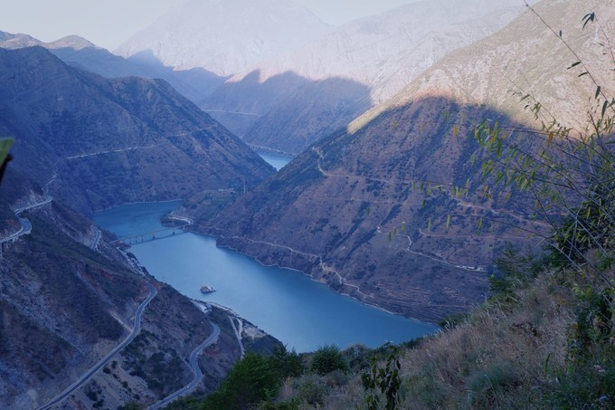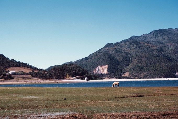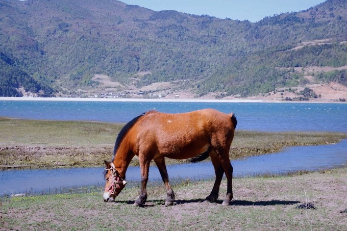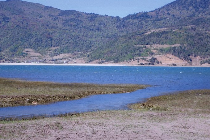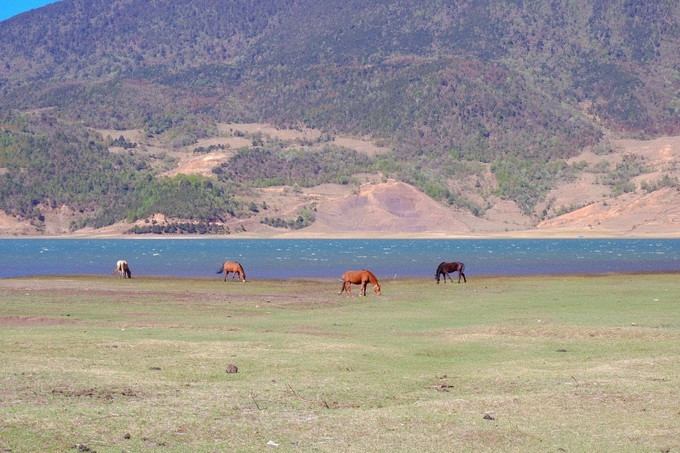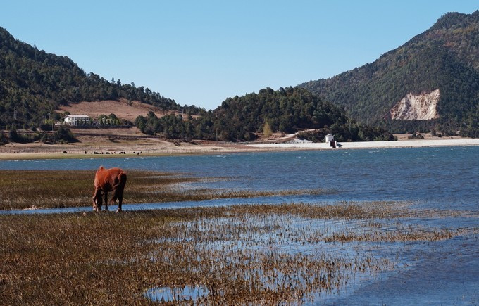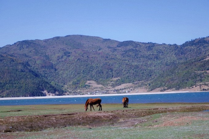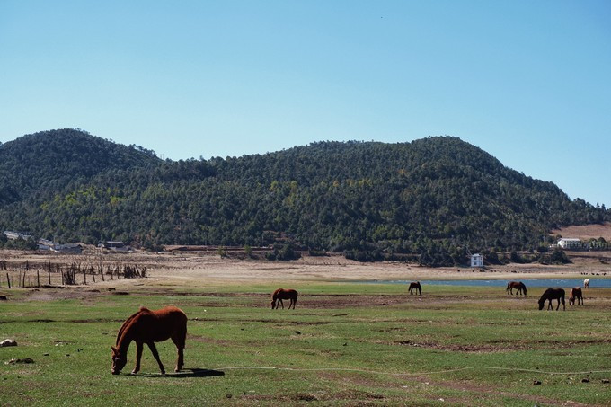 从盘山路下坡开始已经能够隐约看到一大片蓝色海洋和微绿的草地,村落集中在湖泊岸边的平地区域。这里的土地资源不够理想,当地居民以畜牧业为生,草地上放牧着成群的牛马!