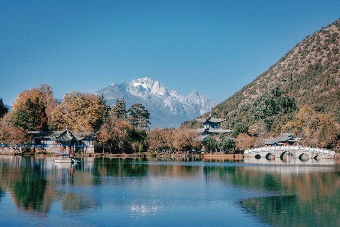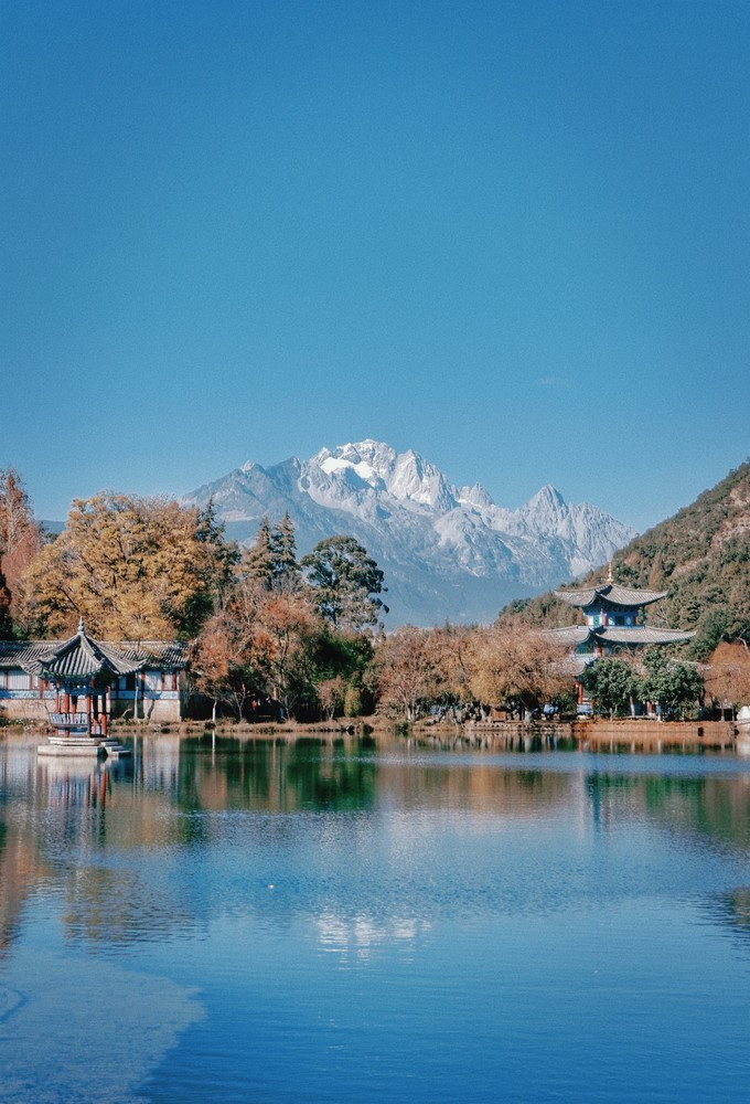 远处是玉龙雪山,晴朗的冬季万里无云,玉龙雪山清晰的轮廓倒影潭池,