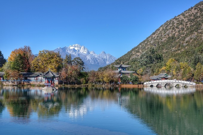 雪山倒映,龙泉山两旁古树,九龙潭,湖水清澈见底,玉龙雪山倒映其中。