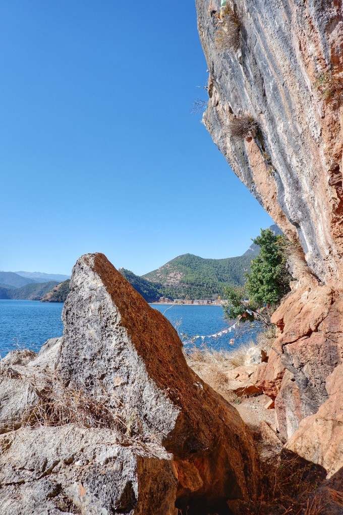 站着嶙峋的乱石堆之中,在峭壁之下,遥望着泸沽湖景,远处的村落成为一纸画卷。
