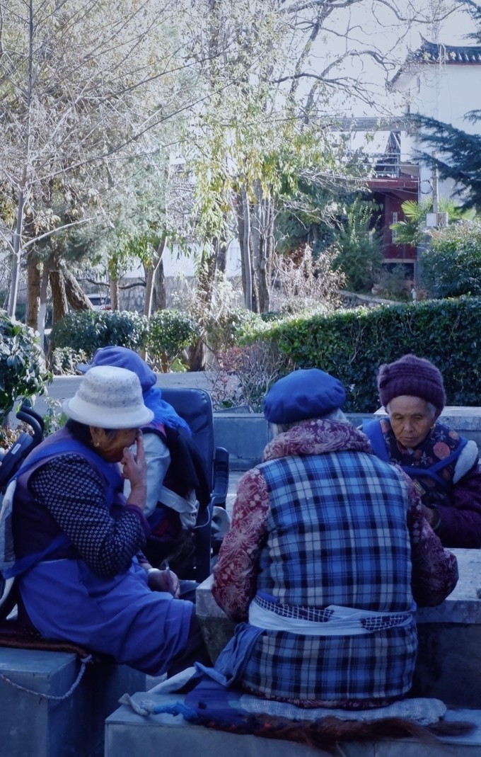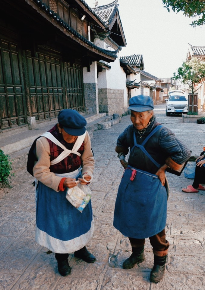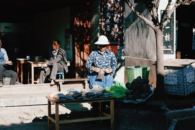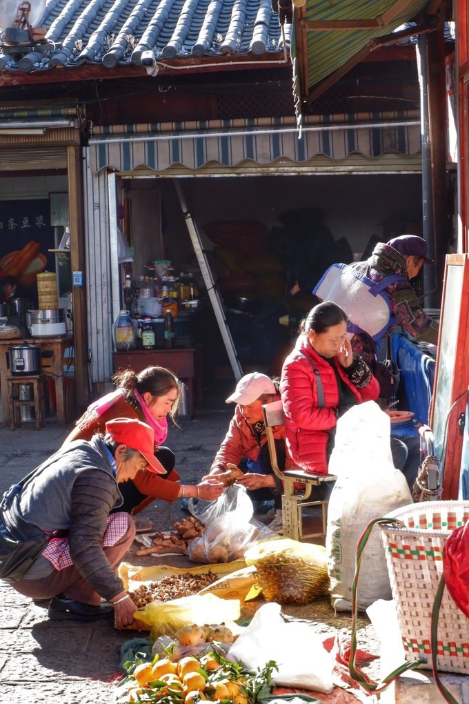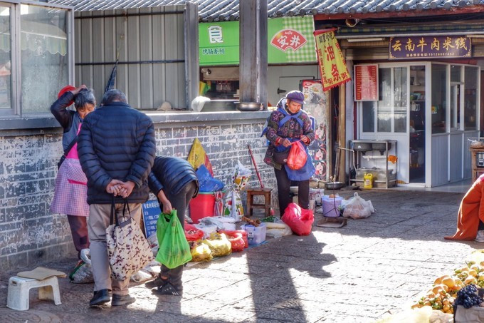 当地老人穿着传统的纳西族服饰,在清晨的阳光下就蹲坐在城墙之下贩卖新鲜的蔬菜。