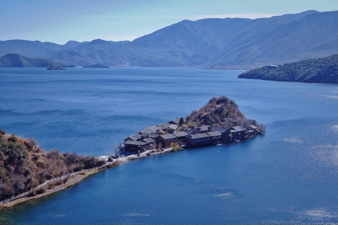 小岛东南西三面临水,北部通向陆地,整座岛屿如同 蓬莱 仙岛,沉睡在泸沽湖的摇篮之中。