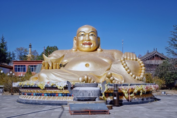 寺庙内悬挂的五色经幡,却呈现出异域风情。藏传佛教的特色在于宝塔金顶,小塔围大塔,