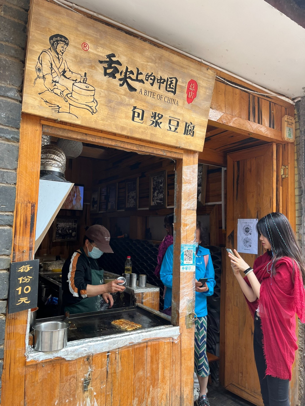 束河古镇真的太适合拍片了。在古镇到处逛一逛。遇见好吃的美食店就停下来没一点美食,比如,我们吃到了很有名的包浆豆腐。这个是上过了《舌尖上的中国》的一道美食。豆腐里面特别嫩,好吃极了。我们在丽江这几天,大概吃了有五六次包浆豆腐吧。