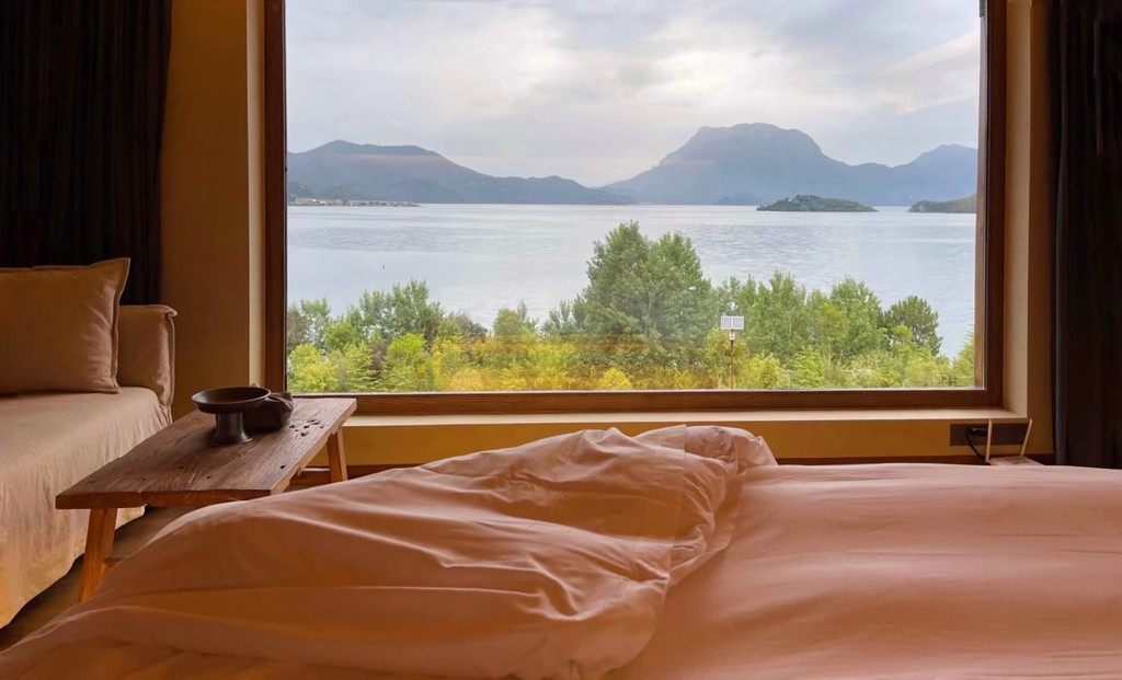 看看这里的湖景房,简直太高级了。我们这个窗户也很大。就这样躺在床上,看着周围的景色,美极了。不得不说,从窗户里面看过去,远处的景色就是一副画啊。绿植有了,山峰有了,湖泊有了,还要什么自行车啊。