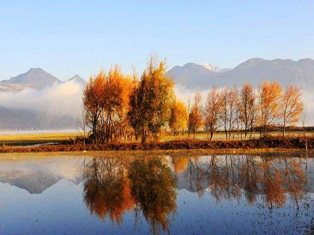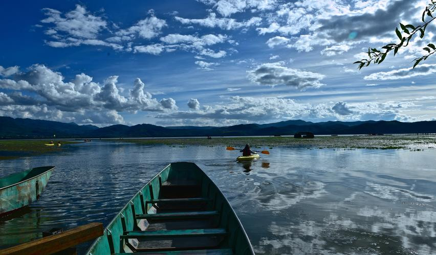 拉市海的天,湛蓝明媚而深邃,如镜的湖面倒映着玉龙雪山。泛舟湖上,湖水清澈透明,可以清晰看到湖心深处摇摆的水草和穿梭的游鱼;天空的反光,使人恍惚觉得船在天上走,鱼在云里游,这一幅幅山水倒影朦胧美的意境,在不经意间流淌着浓郁的诗一般的情韵。