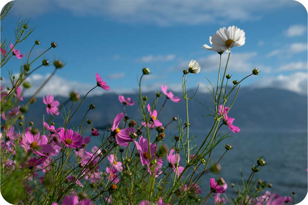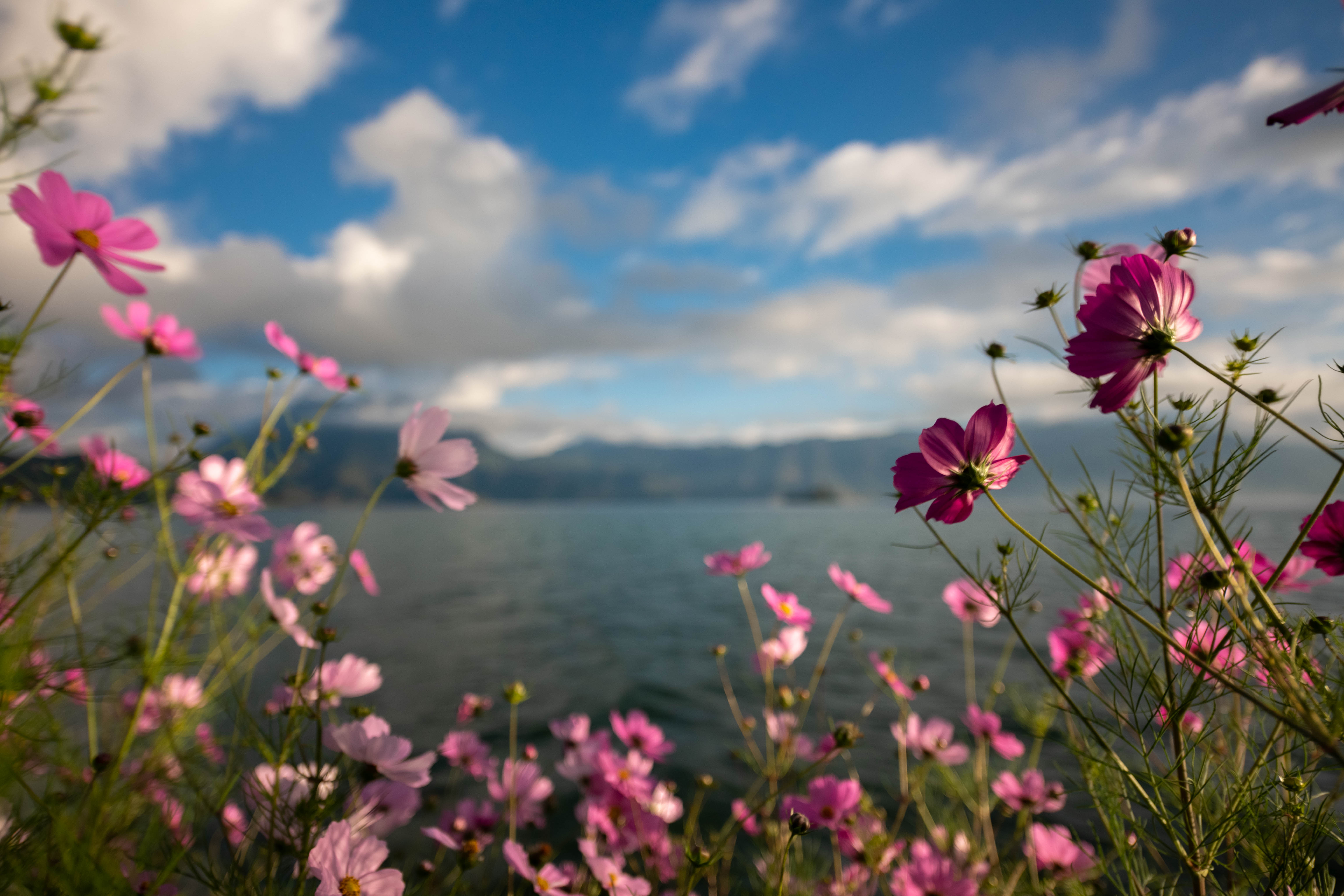 蓝天白云之下,湖畔的格桑花,真的是太美了~