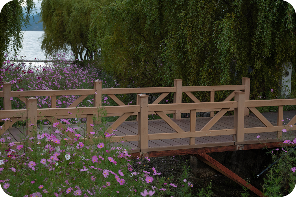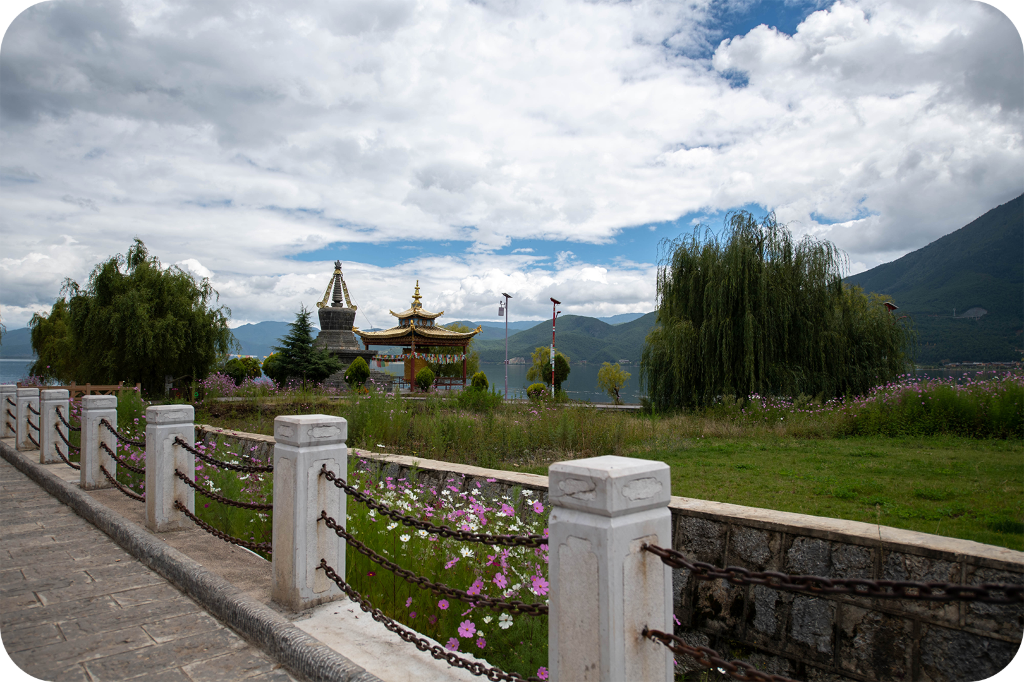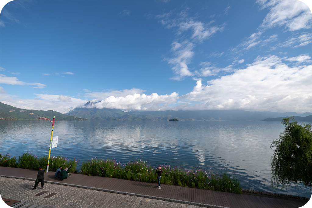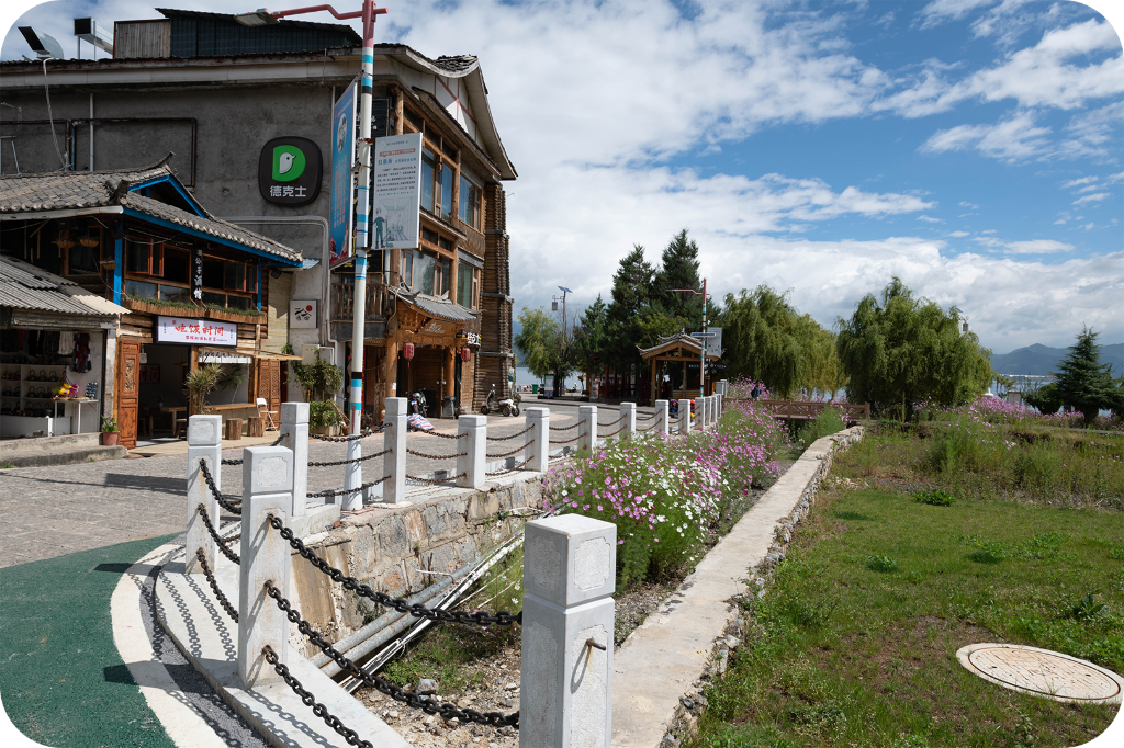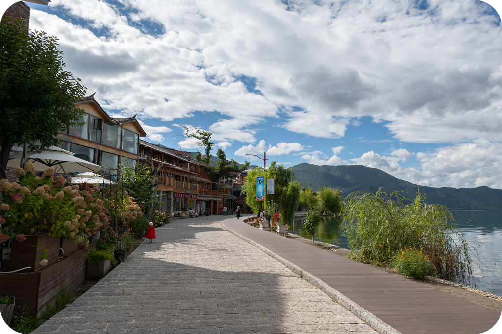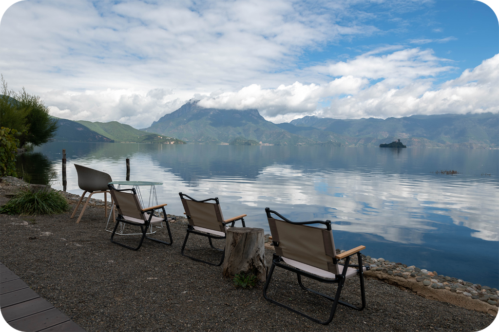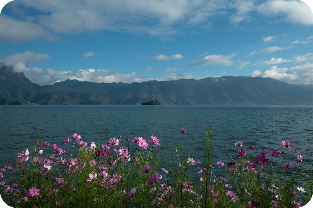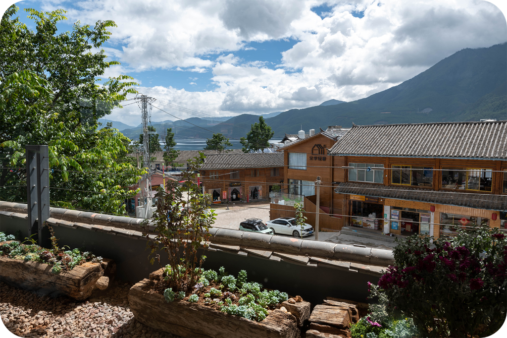 泸沽湖畔,有座椅,有鲜花,有山有水有风景。