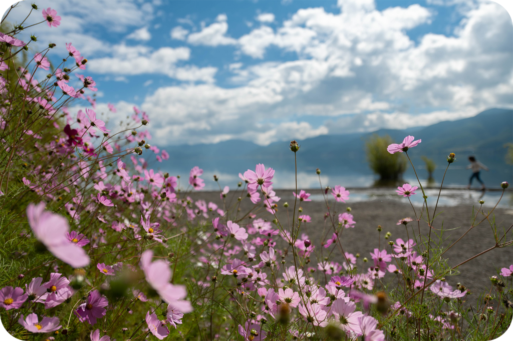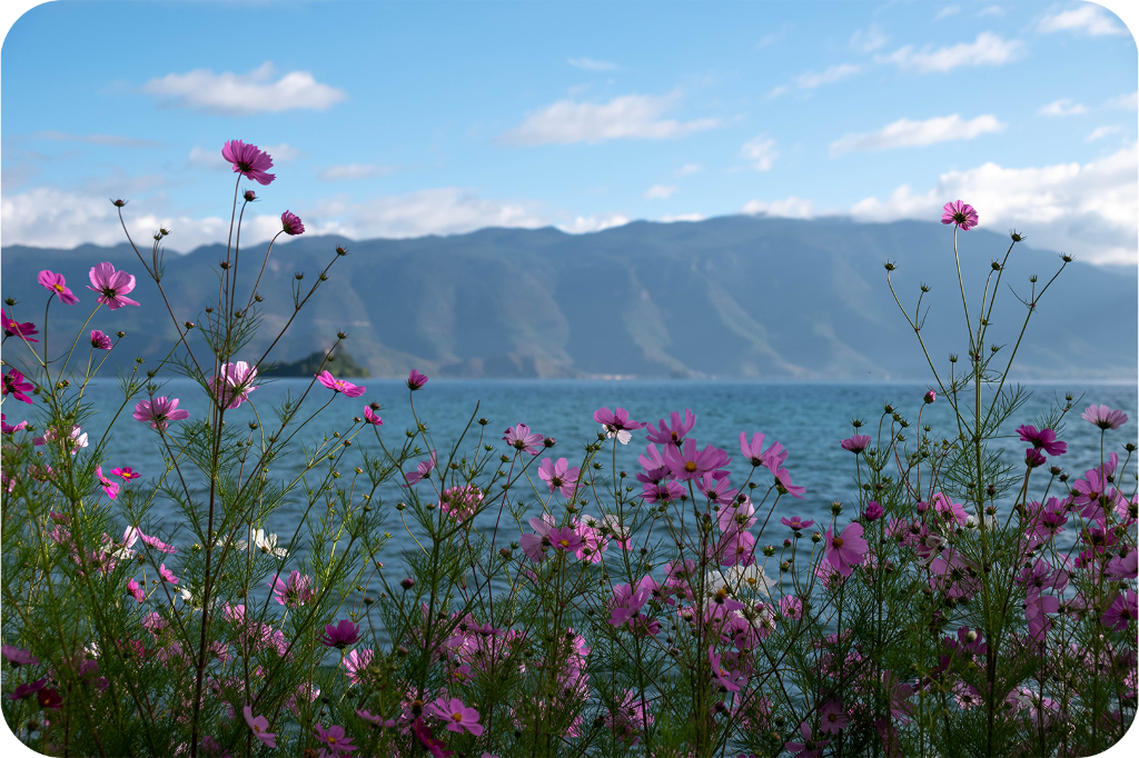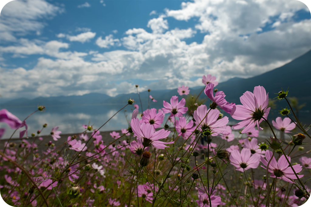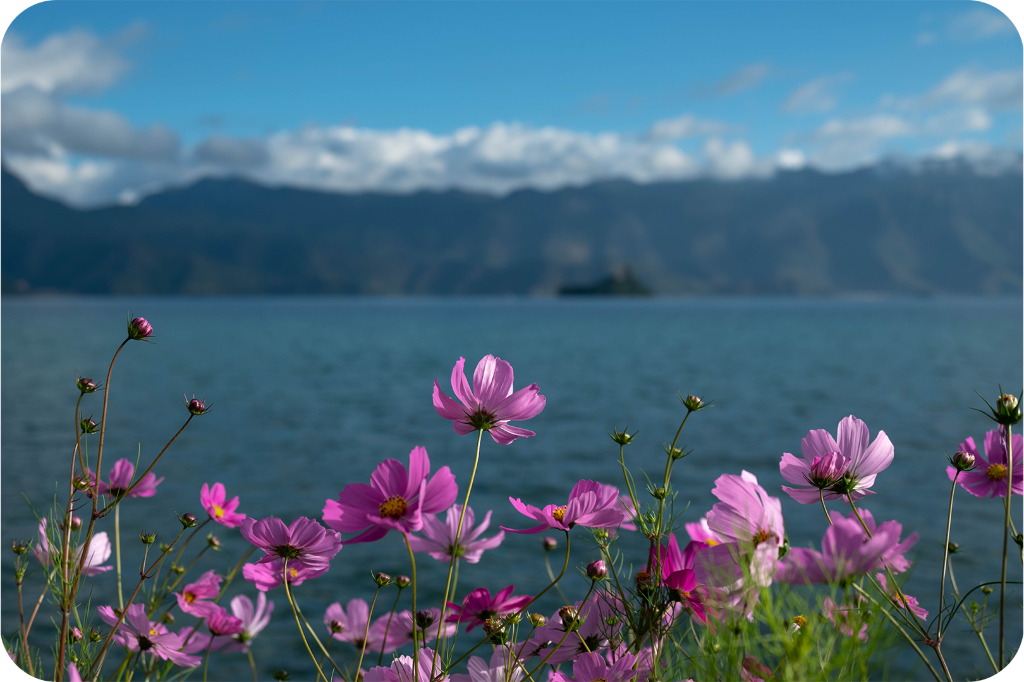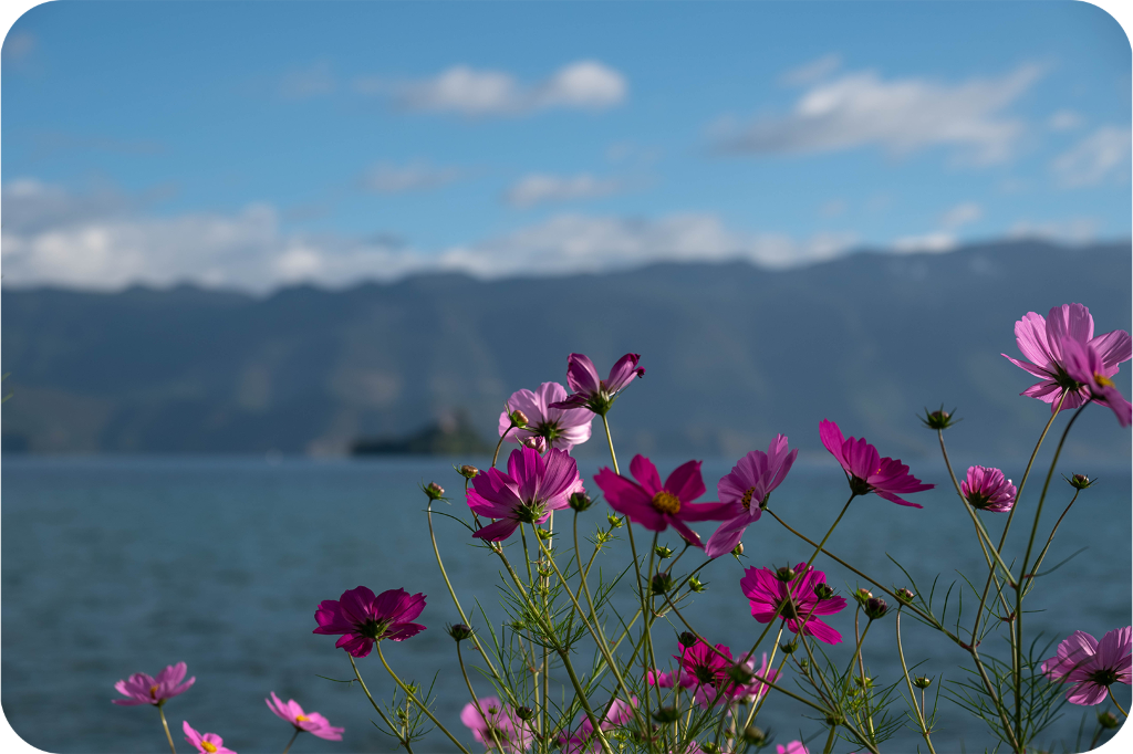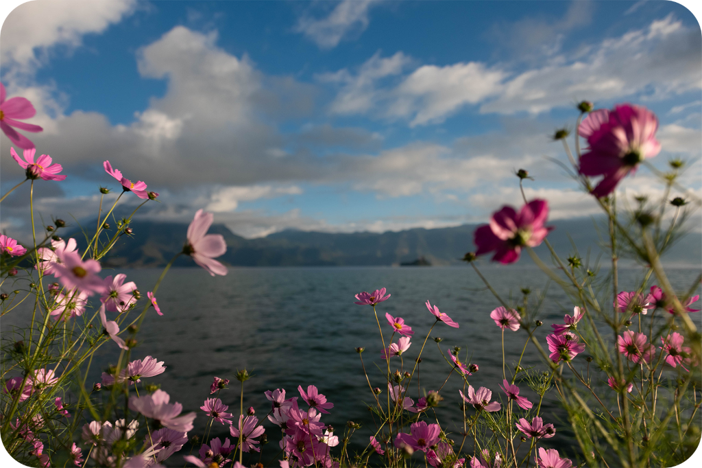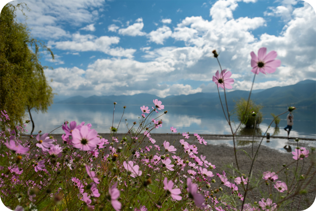 阳光洒满大地,湖畔的格桑便成为了泸沽湖畔最迷人的风景。