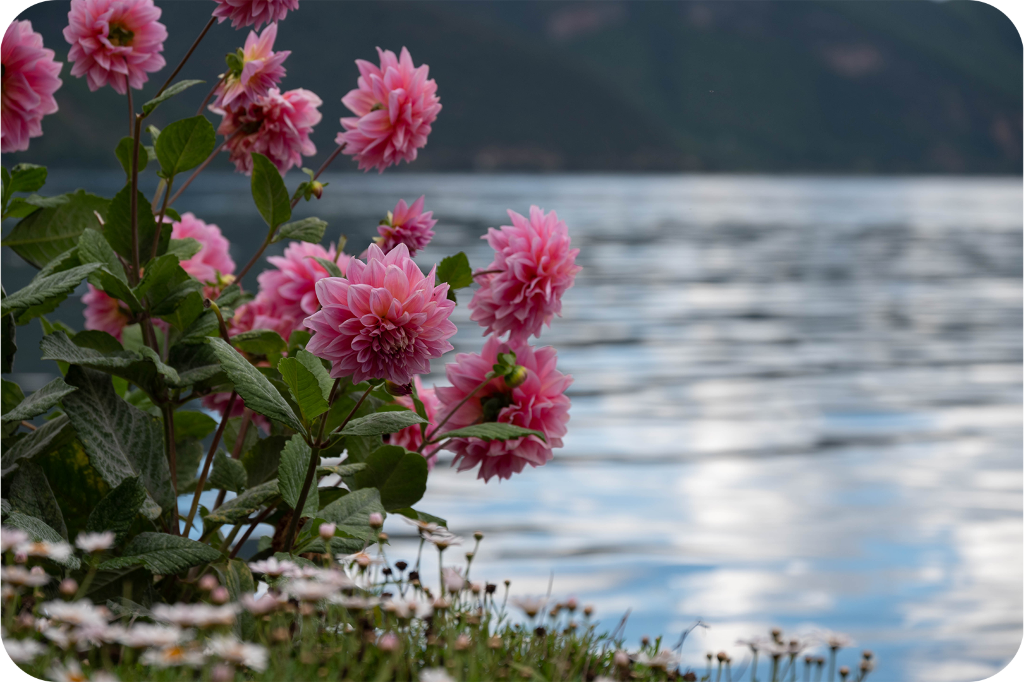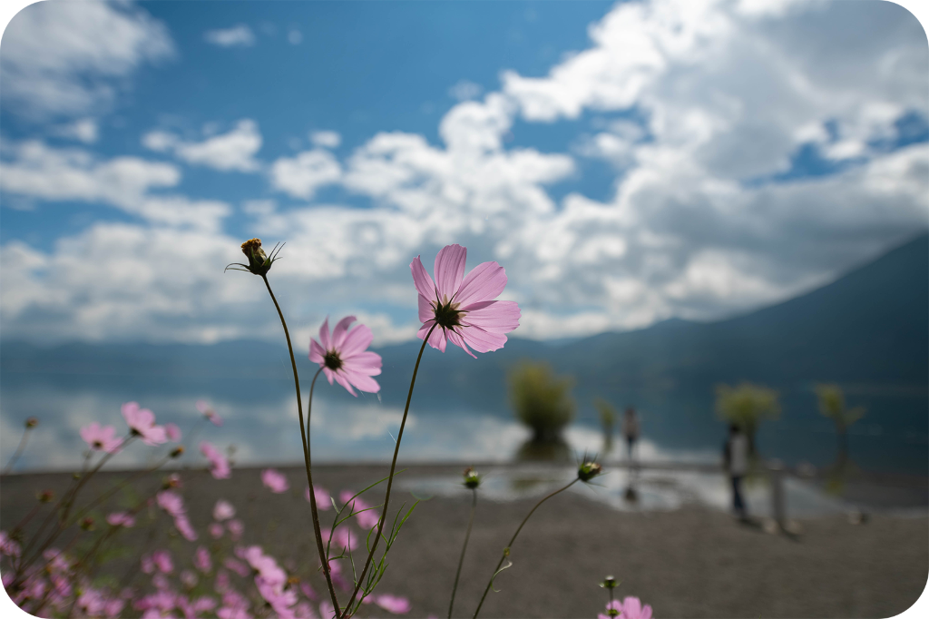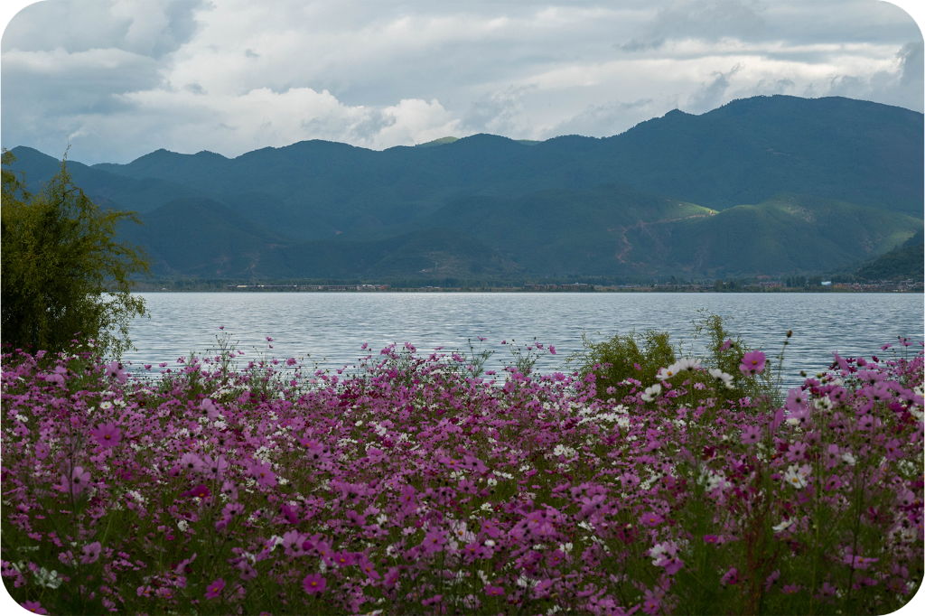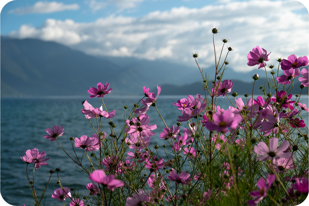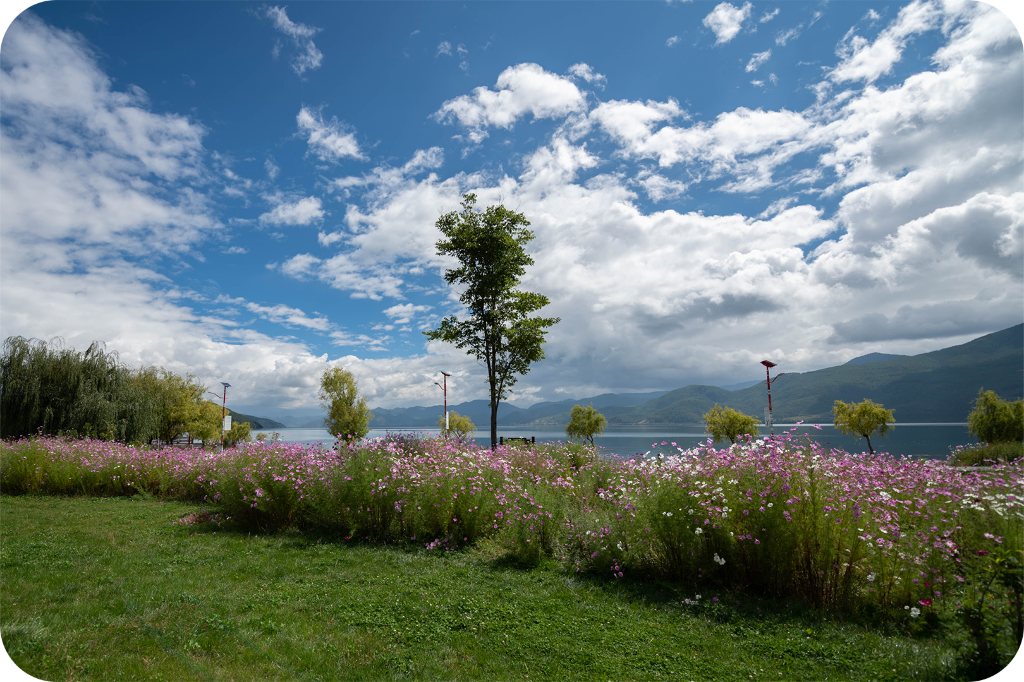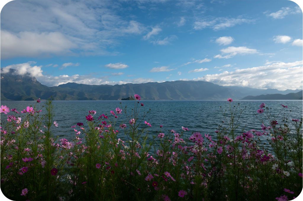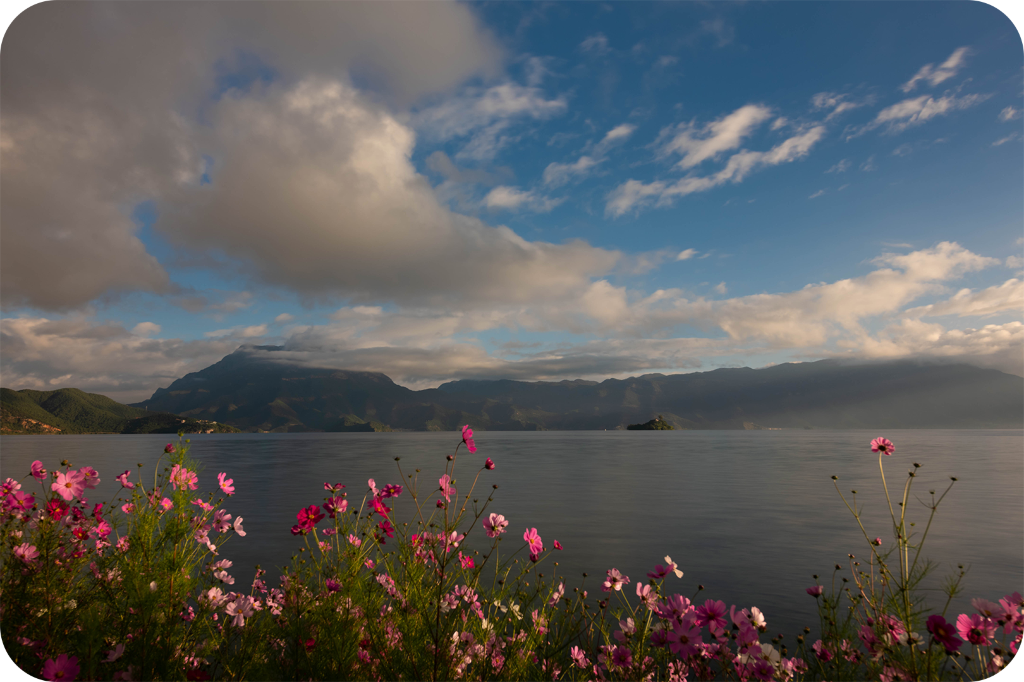 阳光洒满大地,湖畔的格桑便成为了泸沽湖畔最迷人的风景。