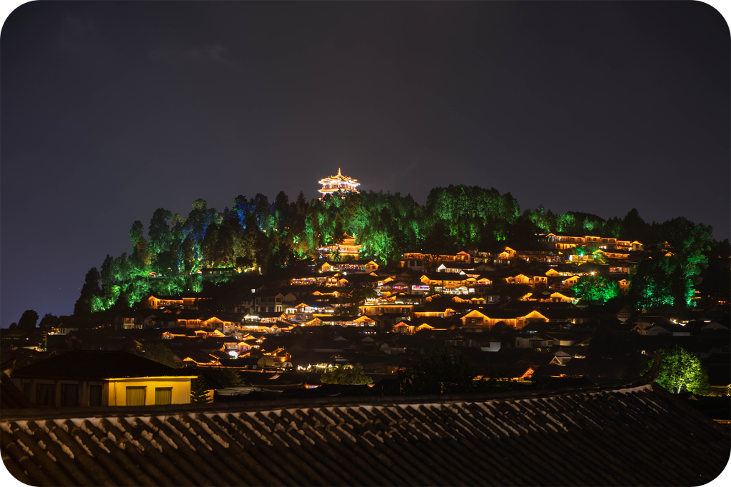 从这里可以看到另一个角度的丽江古城夜景,远处绿色灯光的所在地便是和这里遥遥相对的狮子山。
