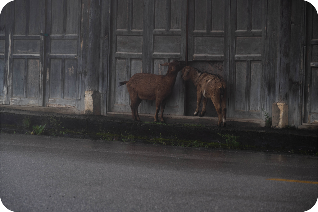 大雨中,两只可爱的小牛只能躲在狭窄的屋檐下避雨,好可怜啊。