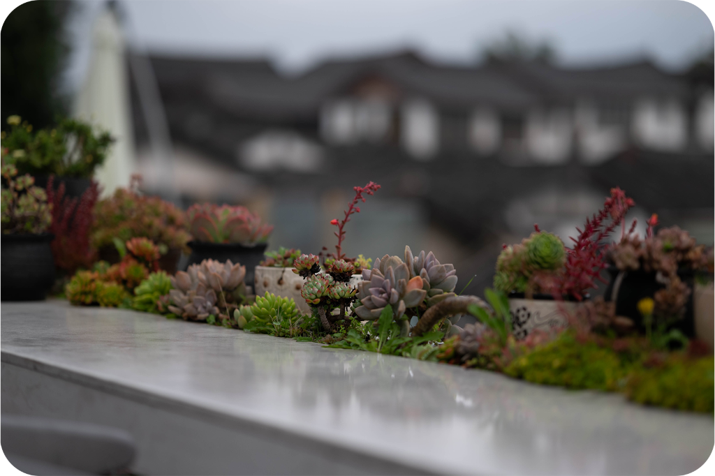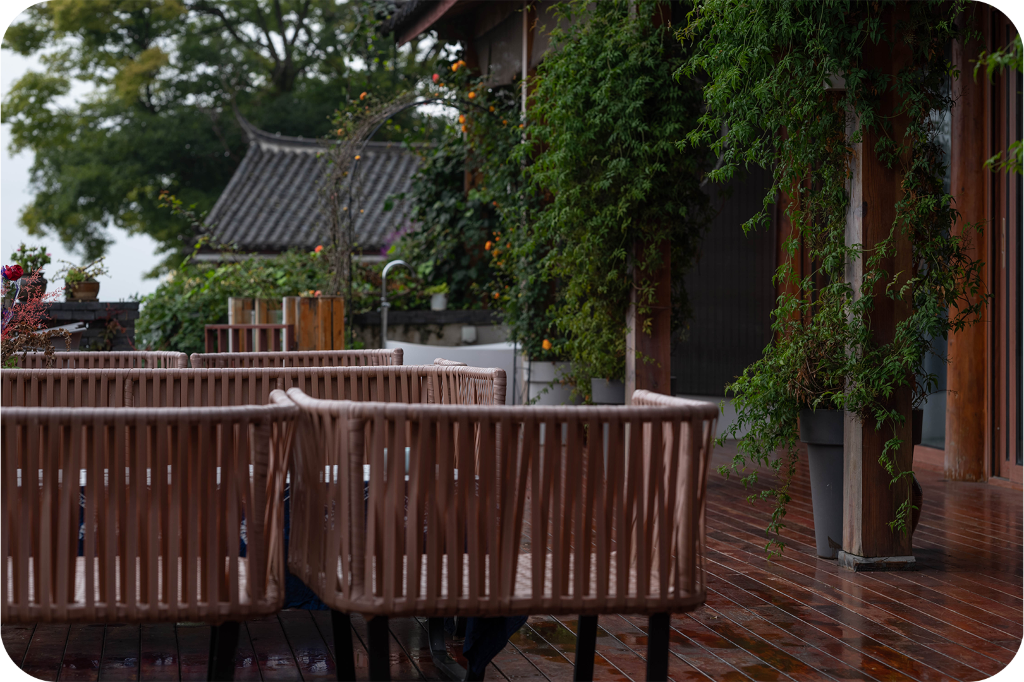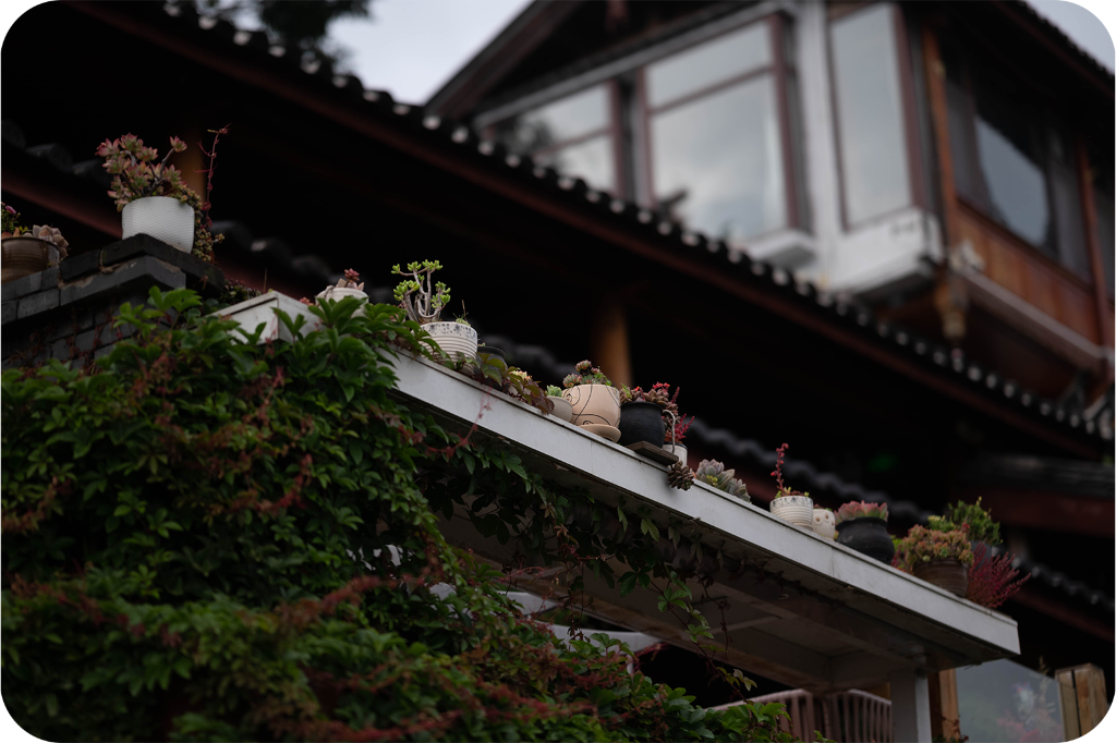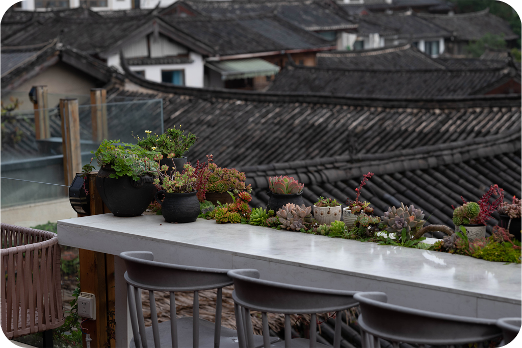 露台上的各种植物,为古色古香的客栈增添了不少生机。