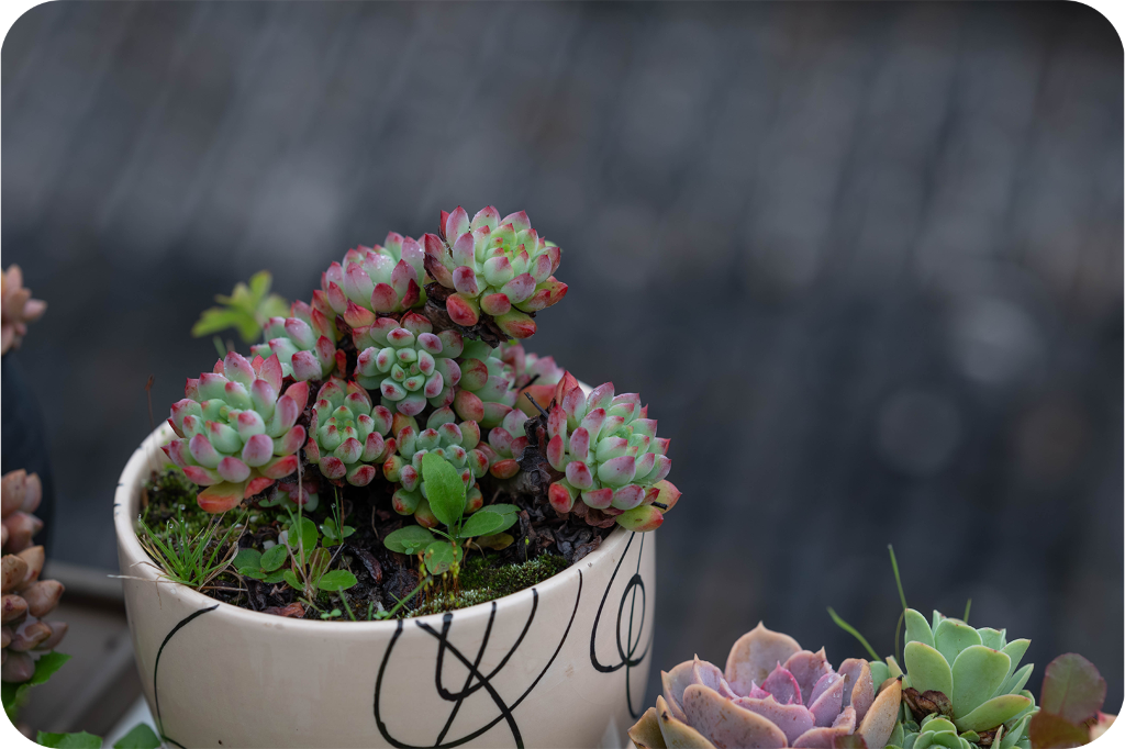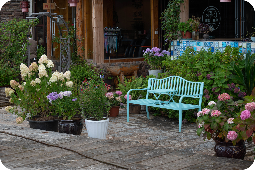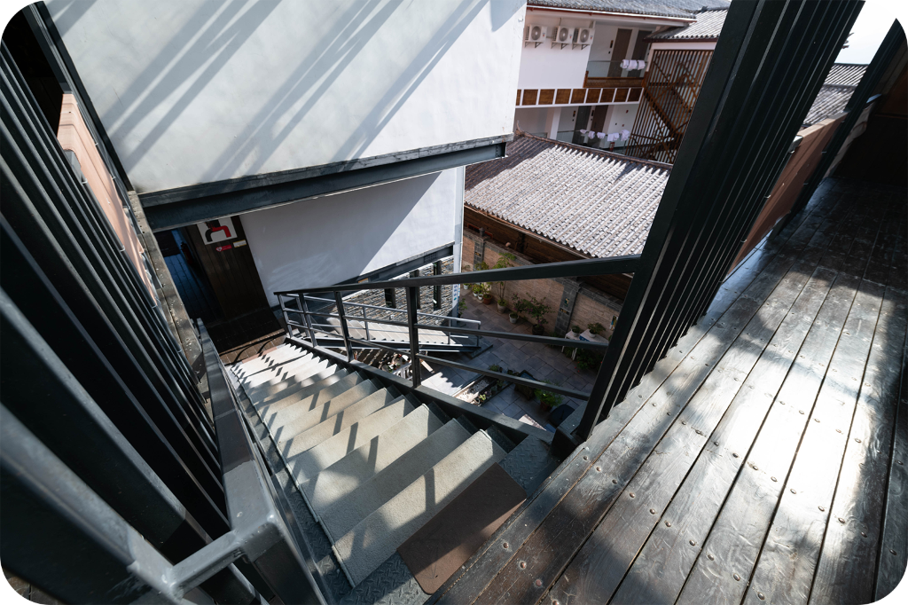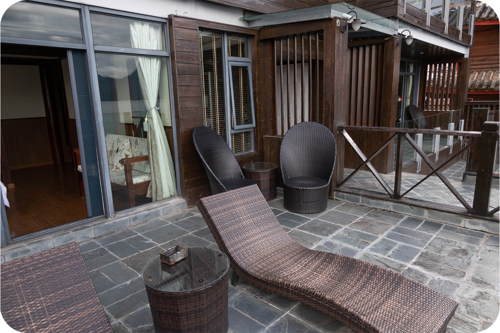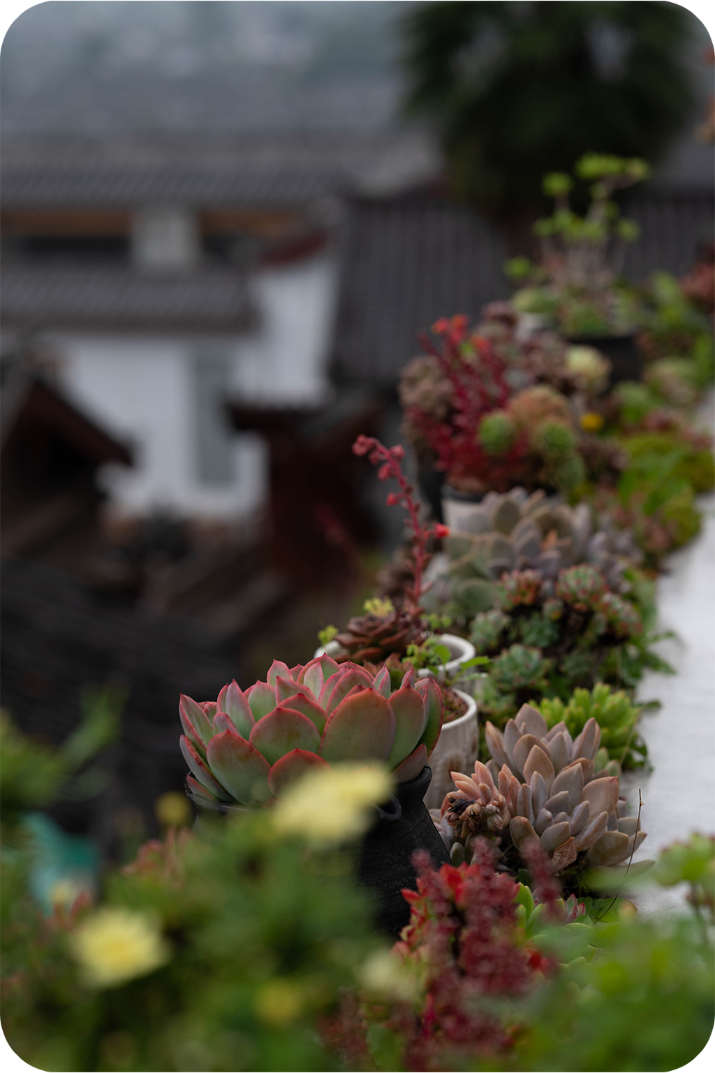 露台上的各种植物,为古色古香的客栈增添了不少生机。