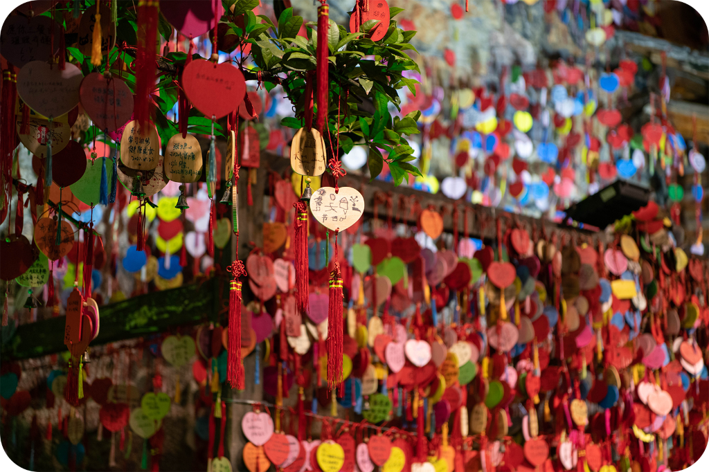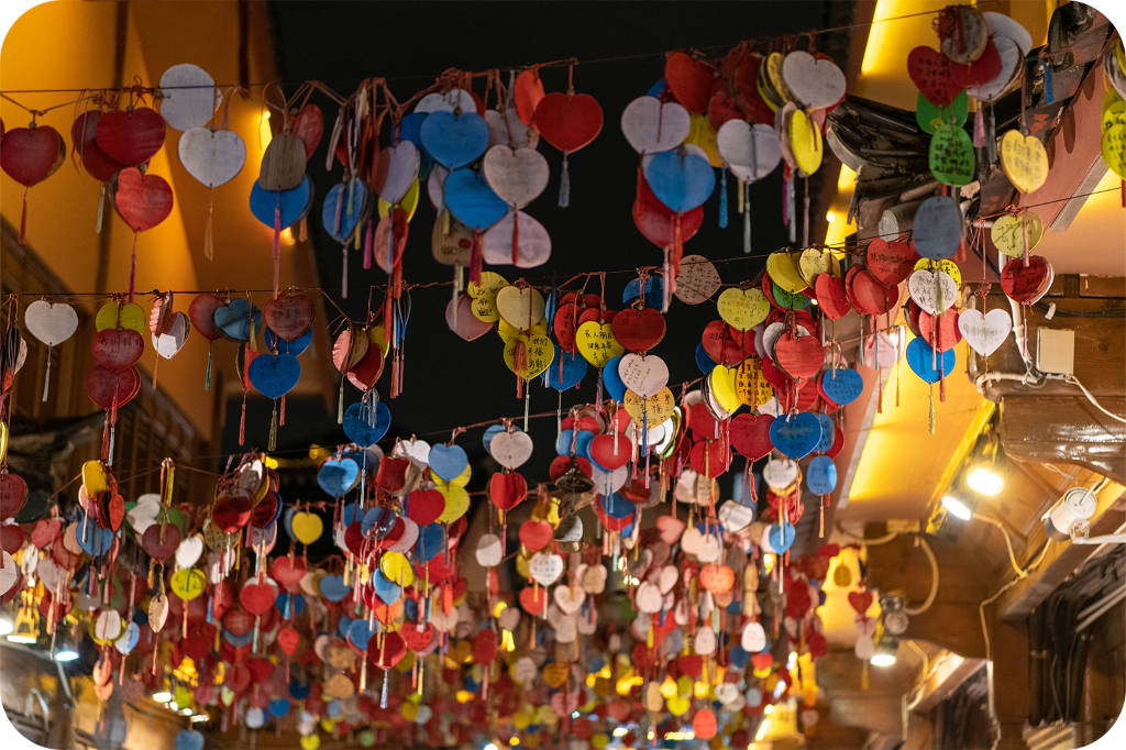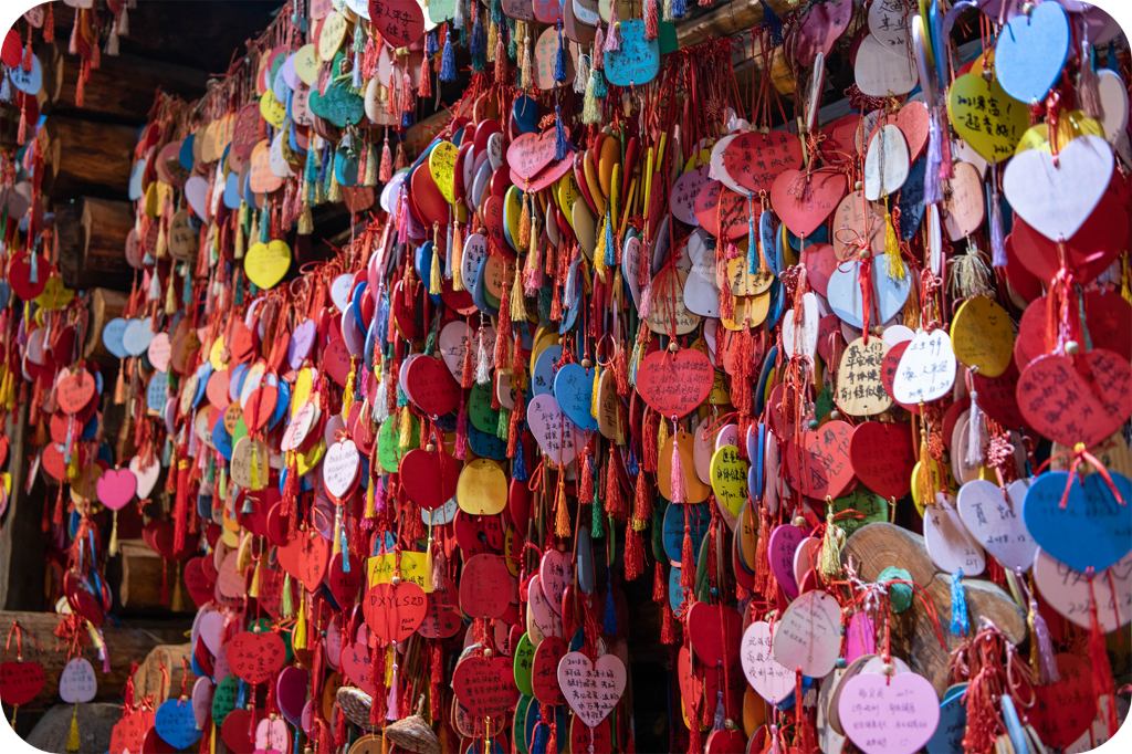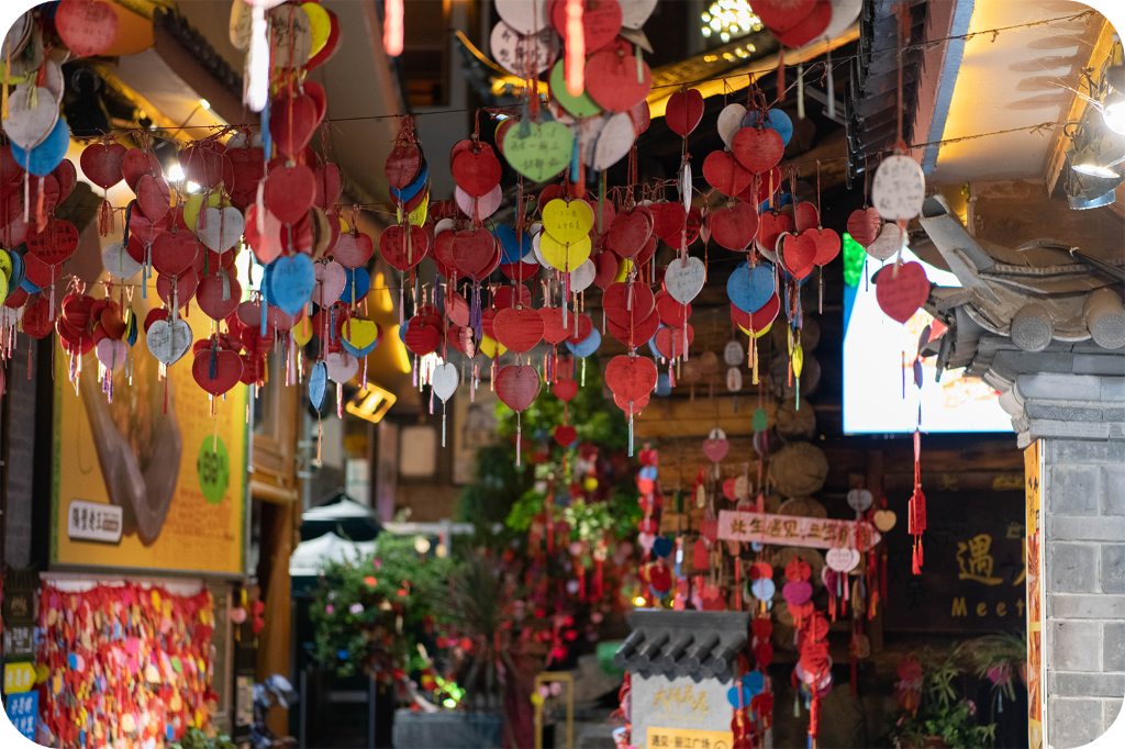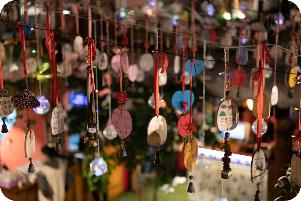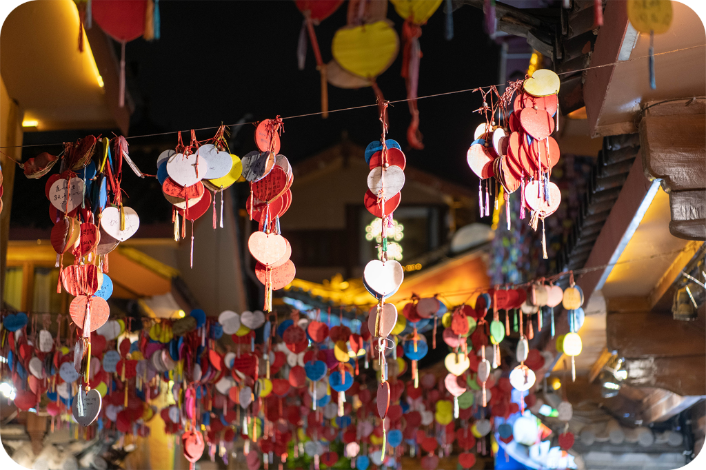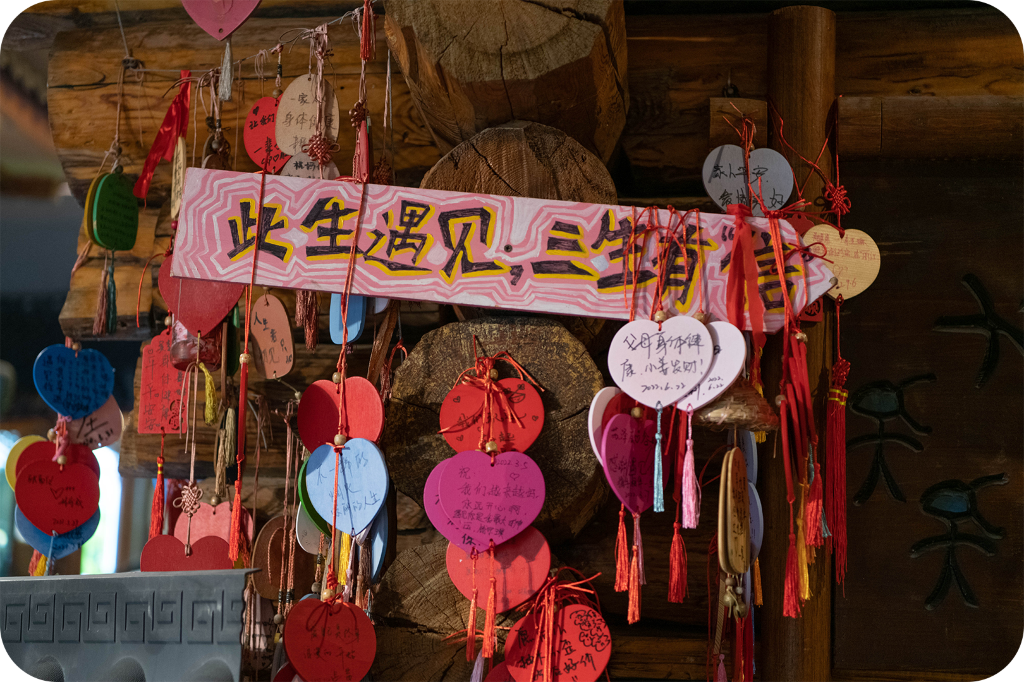 花巷内的各个角落里,都悬挂着五颜六色的许愿牌。