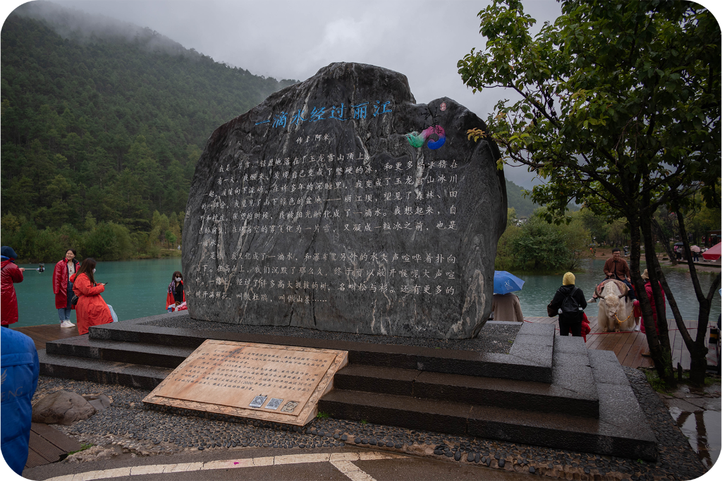 走下栈道,首先看到的是这块“一滴水流过丽江”的大石碑。