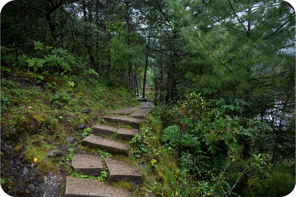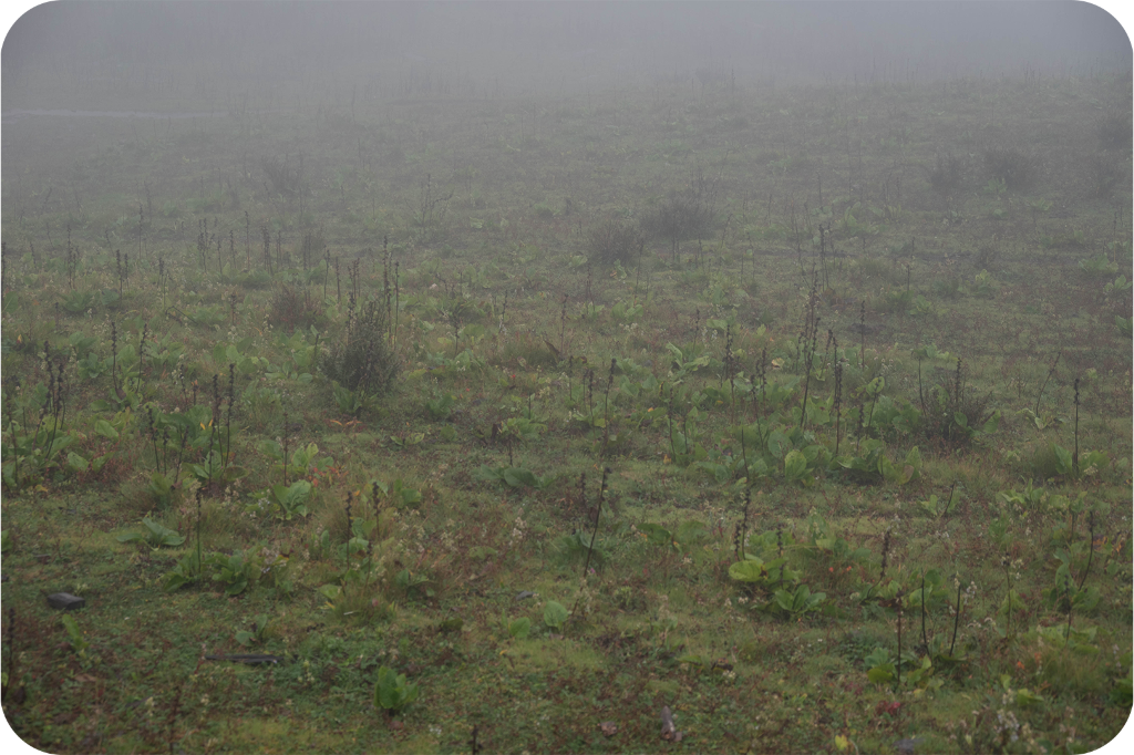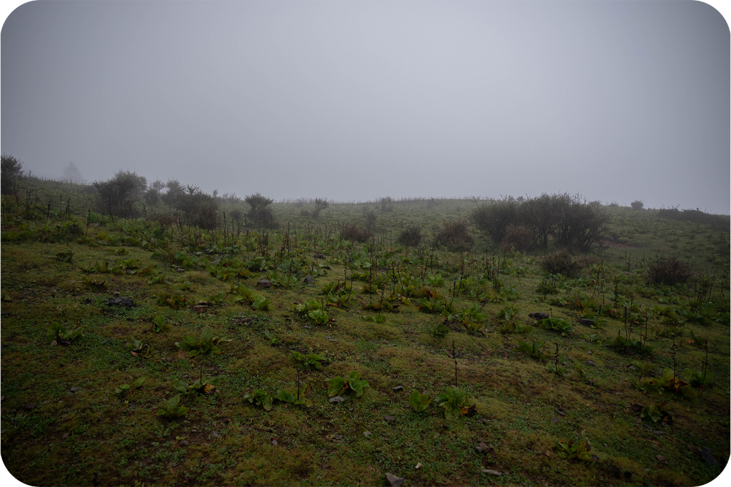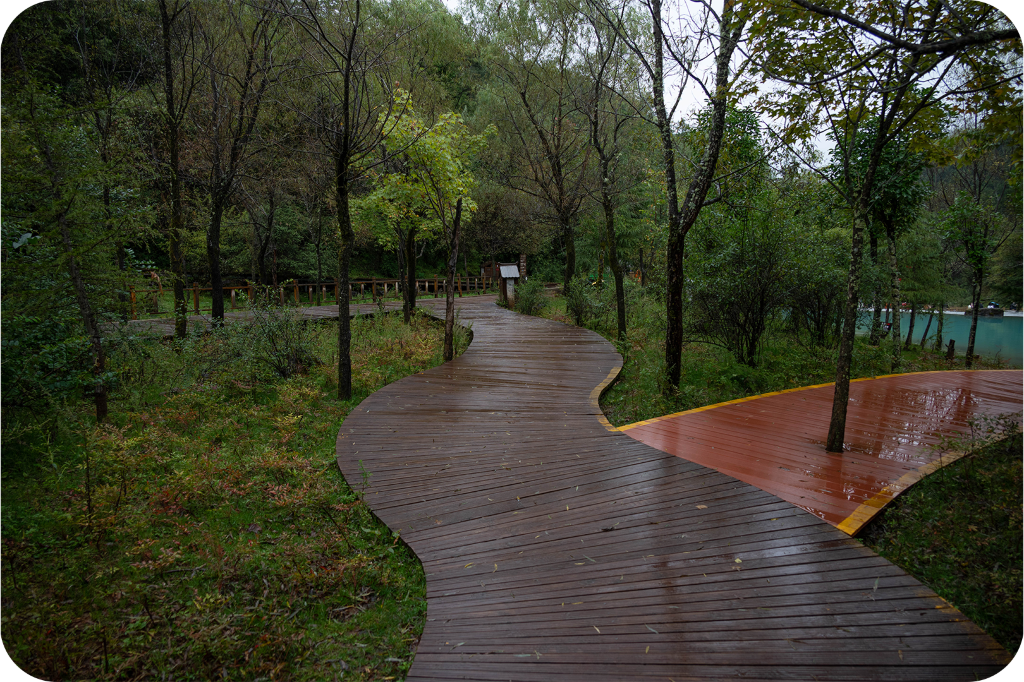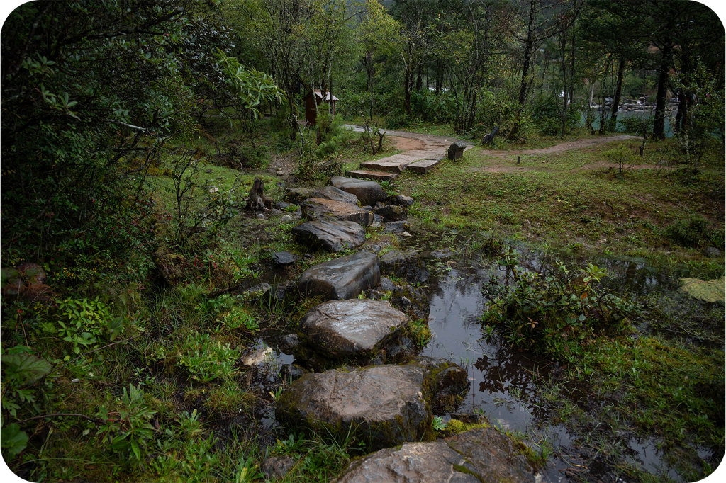 牦牛坪的栈道很短,只有几十级台阶,走下了栈道之后,便会来到一片草坪。