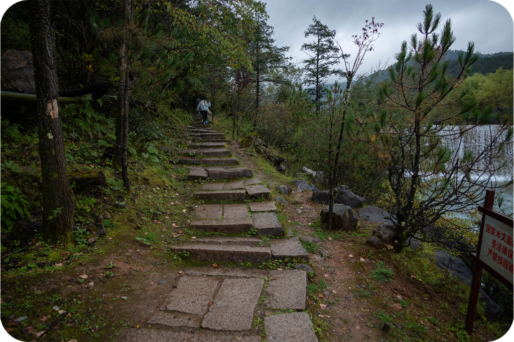 走上镜潭湖旁边的栈道,旁边便是蓝月谷最大的瀑布。