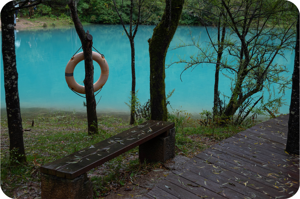 沿着栈道向前,可以看到往栈道方向的湖水深度越来越浅,颜色也慢慢从绿色过渡到了透明。