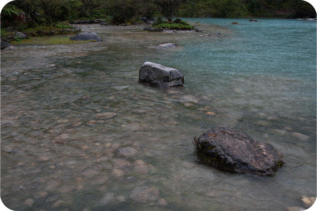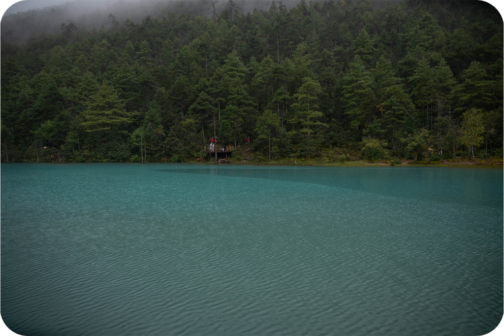 虽然雨势不小,但丝毫没有影响蓝月湖的美。