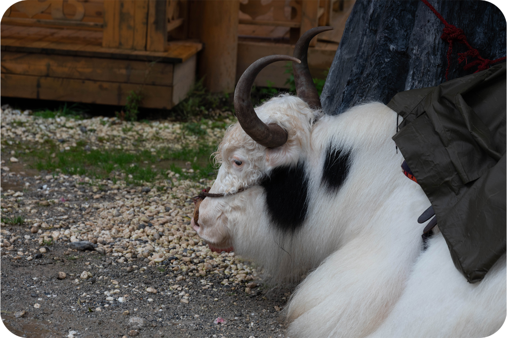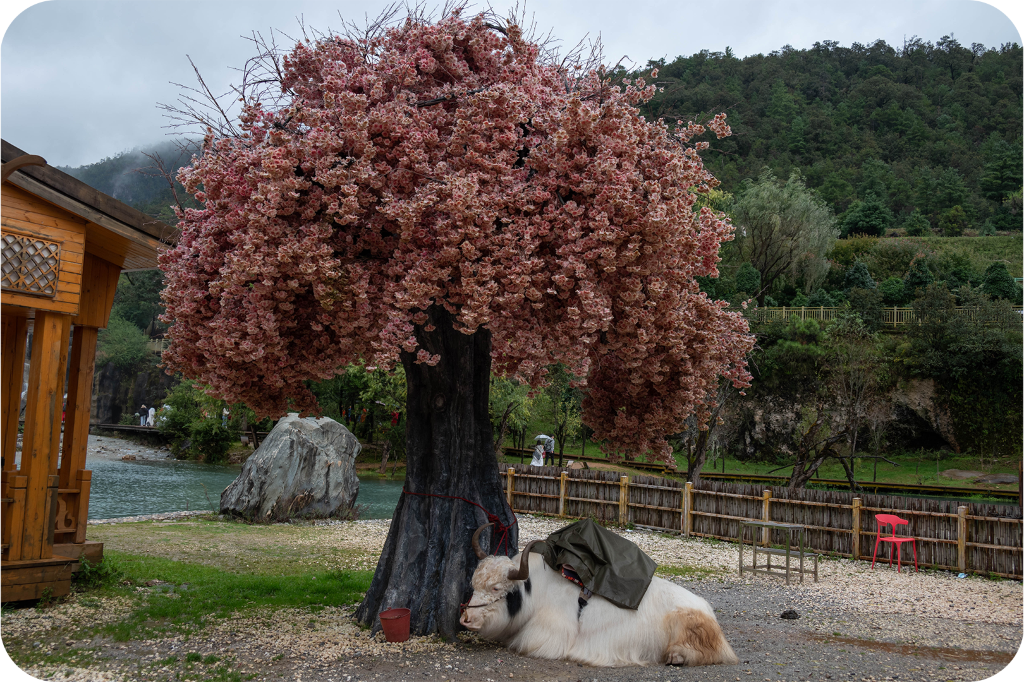 木屋旁边的粉红色树下有一头牦牛,可以和它合影留念。