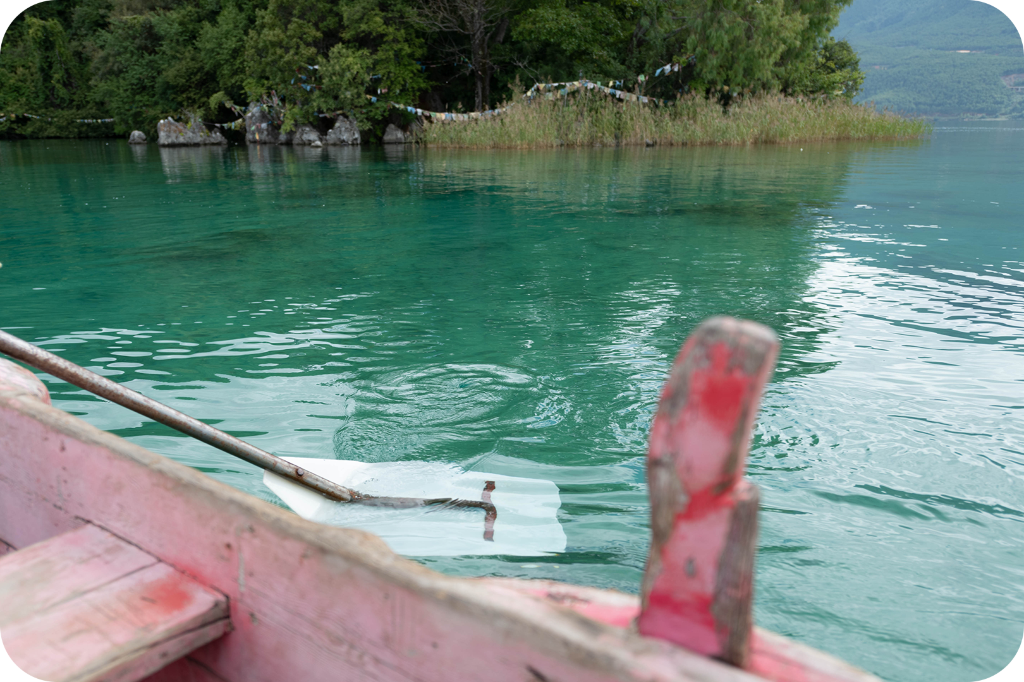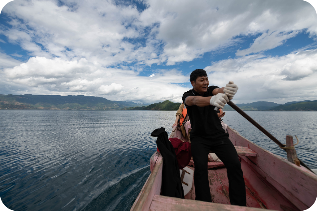 为我们掌舵的是一位摩梭族大叔,和印象中的划船不同,泸沽湖这边都是单侧操作的。