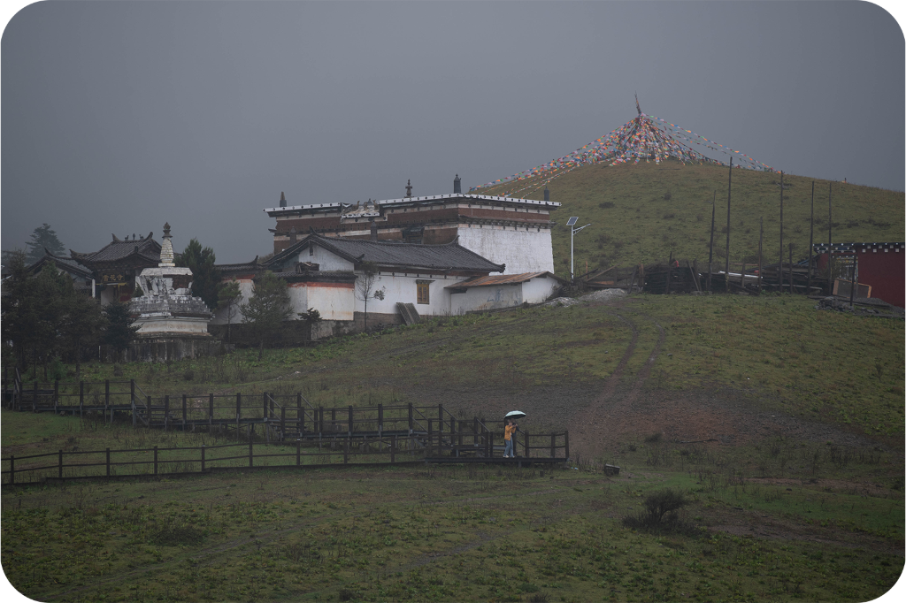牦牛坪前方还有一座雪花寺,山坡的最上方还绑着藏族的经幡。