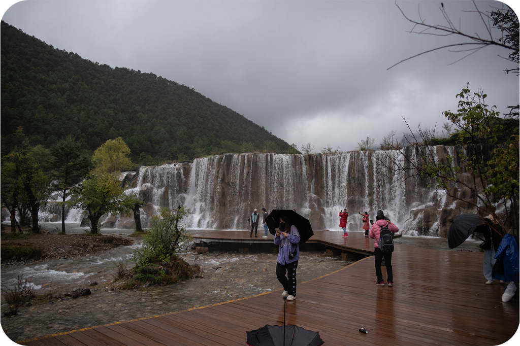 当到达玉龙雪山游客中心的时候,前一秒太阳还露个小脸,后一秒就下起了小雨,蓝天早已消失得无影无踪。